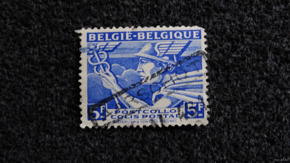 Изображенная марка — это бельгийская служебная марка «Меркурий» для посылок номиналом 5 франков (5F), выпущенная в 1945 году. Марка синего цвета и на ней изображено аллегорическое изображение Меркурия, римского бога торговли и путешествий, держащего кадуцей.