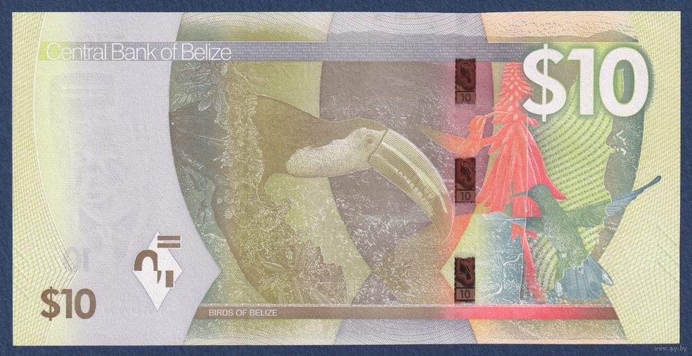Белиз, 10 долларов 2025 г., P-W75 (FA, политик Филип Голдсон, килеклювый тукан, колибри-отшельник), UNC