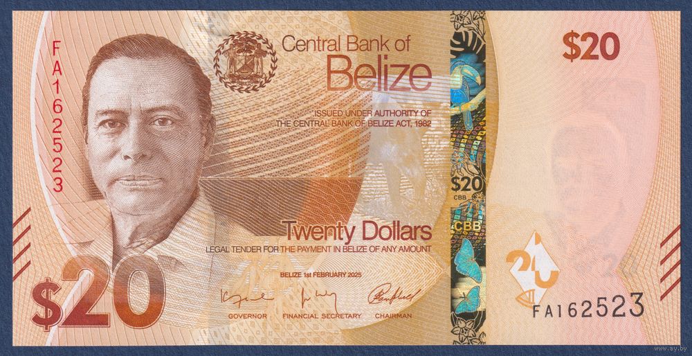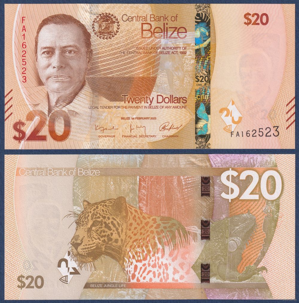 Белиз, 20 долларов 2025 г., P-W76 (FA, премьер-министр Джордж Кэдл Прайс, тапир, ягуар и игуана), UNC
