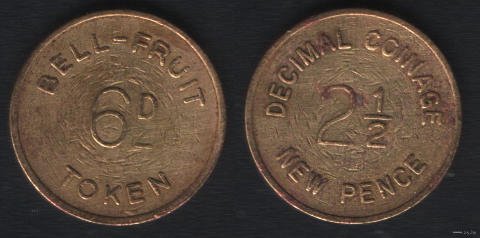 Bell-Fruit Token 6D -- Decimal Coinage 2 1/2 new pence (желтая) (18,6мм3,29гр) (крупн.шрифт) (f3