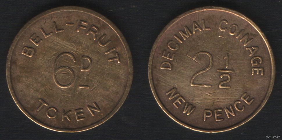 Bell-Fruit Token 6D -- Decimal Coinage 2 1/2 new pence (желтая) (18,6мм3,35гр) (крупн.шрифт) (f2