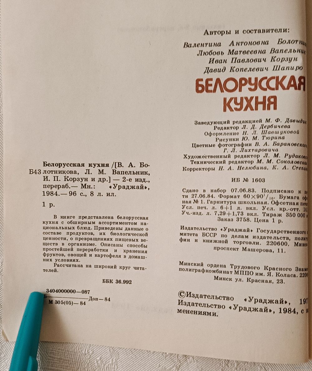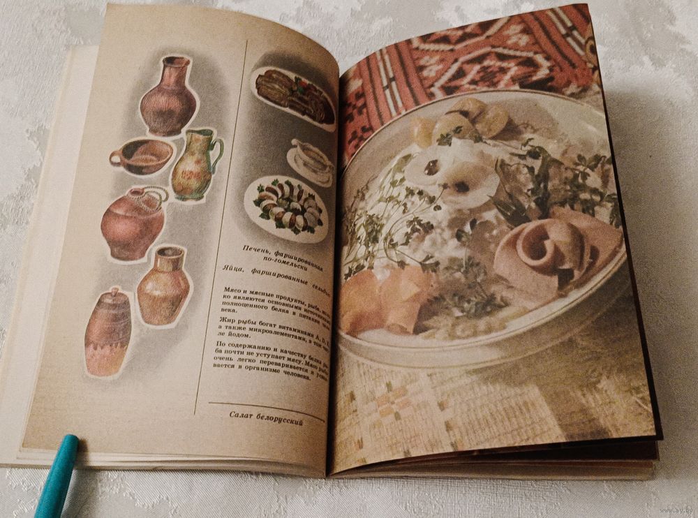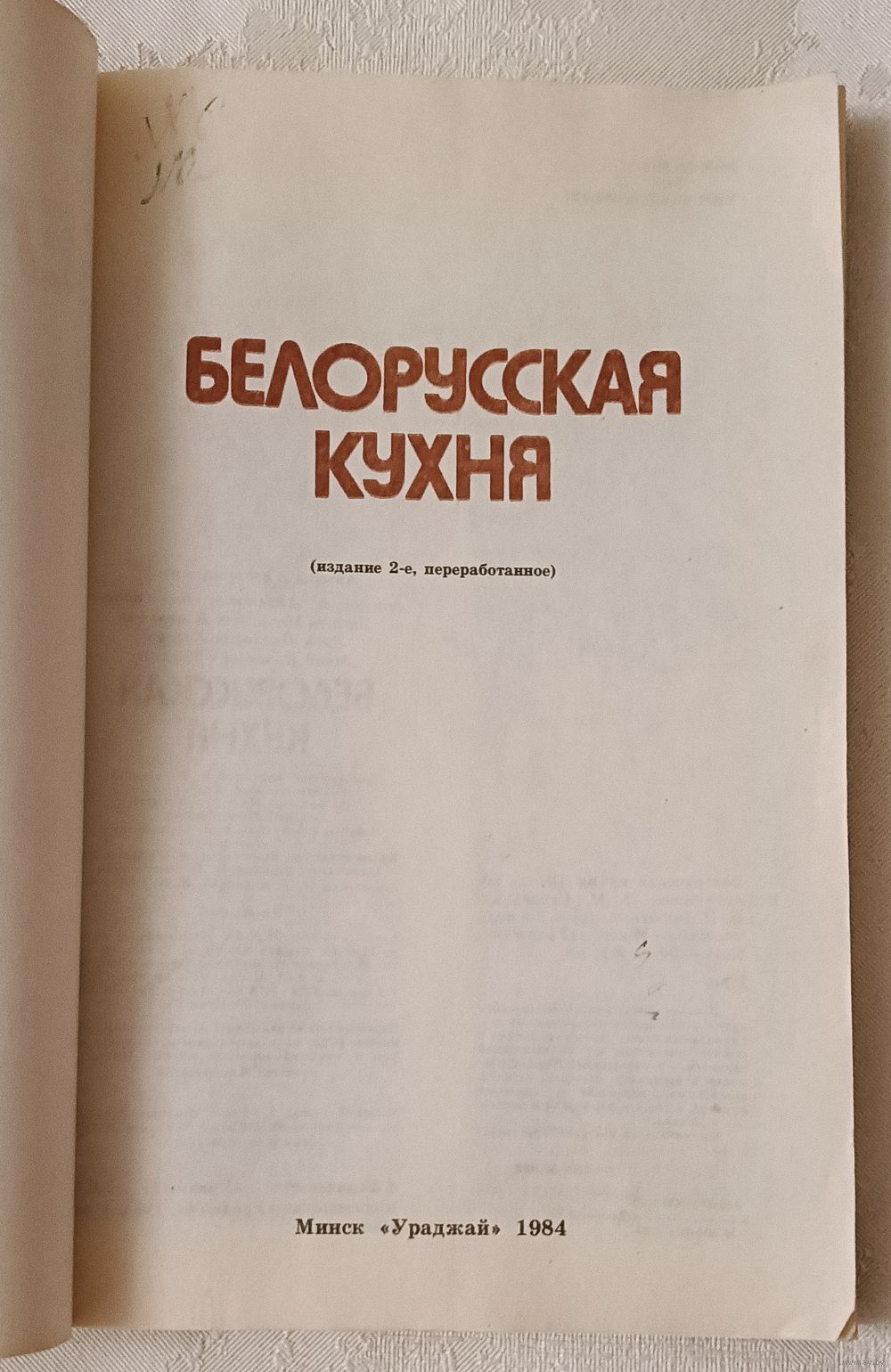 Белорусская кухня. В. А. Болотникова, Л. М. Вапельник, И. П. Корзун и др. 2-е изд., перераб.- Мн.: «Ураджай»,1984.-96 с., 8 л. ил., мягкий переплёт, обычный формат.