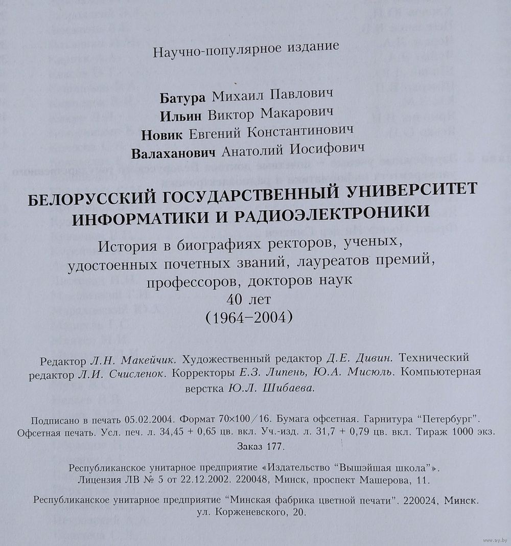 Белорусский государственный университет информатики и радиоэлектроники: история в биографиях ректоров, ученых, удостоенных почетных званий, лауреатов премий, профессоров, докторов наук: 40 лет (1964-2004) / М.П.Батура (рук.), В.М.Ильин, Е.К.Новик, А.И.Валаханович. - Мн. : Вышэйшая школа. 2004 г. 421 с. Твердый переплет. Увеличенный формат.