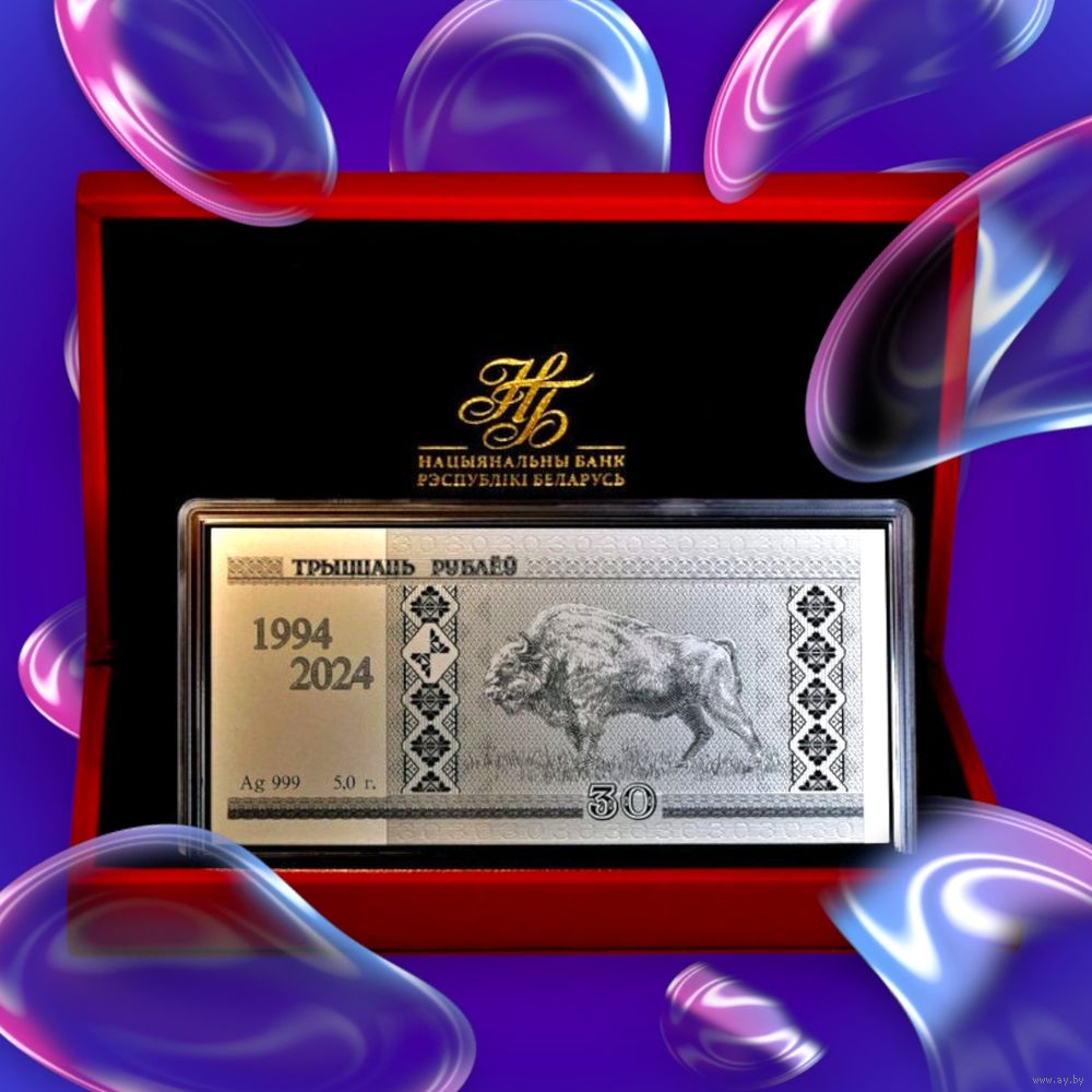 вверху слева – надпись ТРЫЦЦАЦЬ РУБЛЁЎ, годы 1994–2024, вес и проба сплава; в центре – изображение зубра в обрамлении национального орнамента; внизу – номинал: 30.