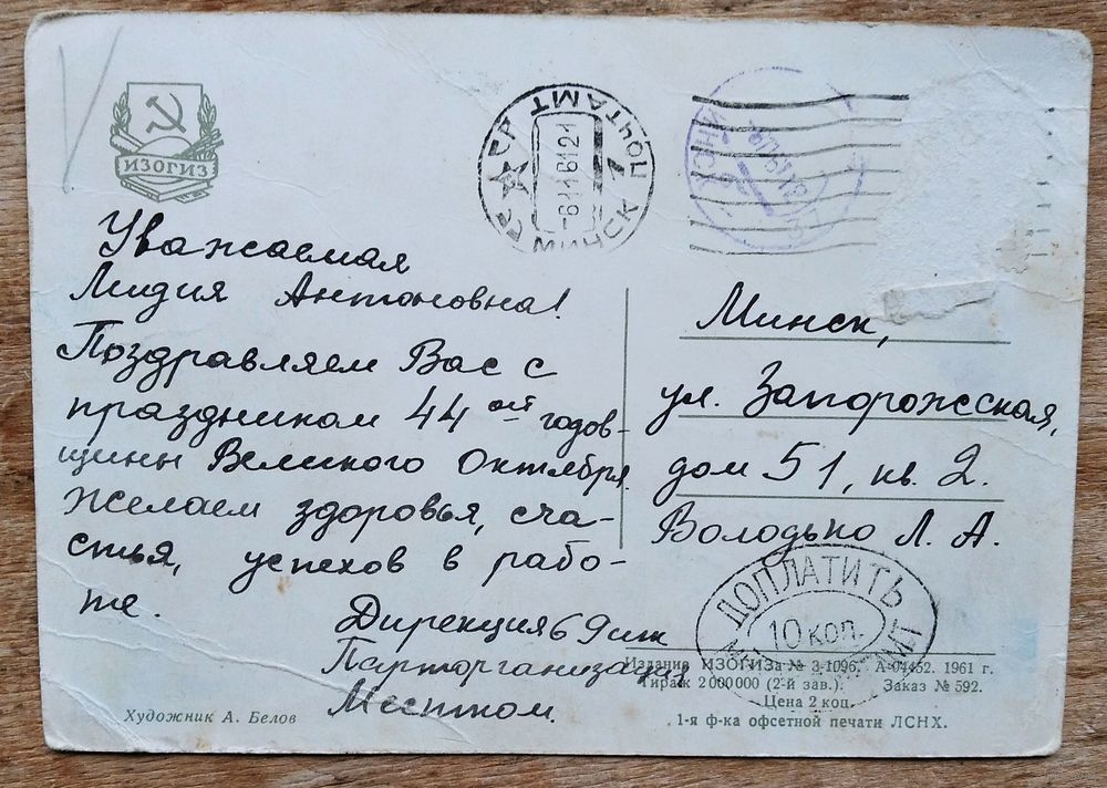 Белов А. С праздником Великого Октября. 1961 г. Подписана.