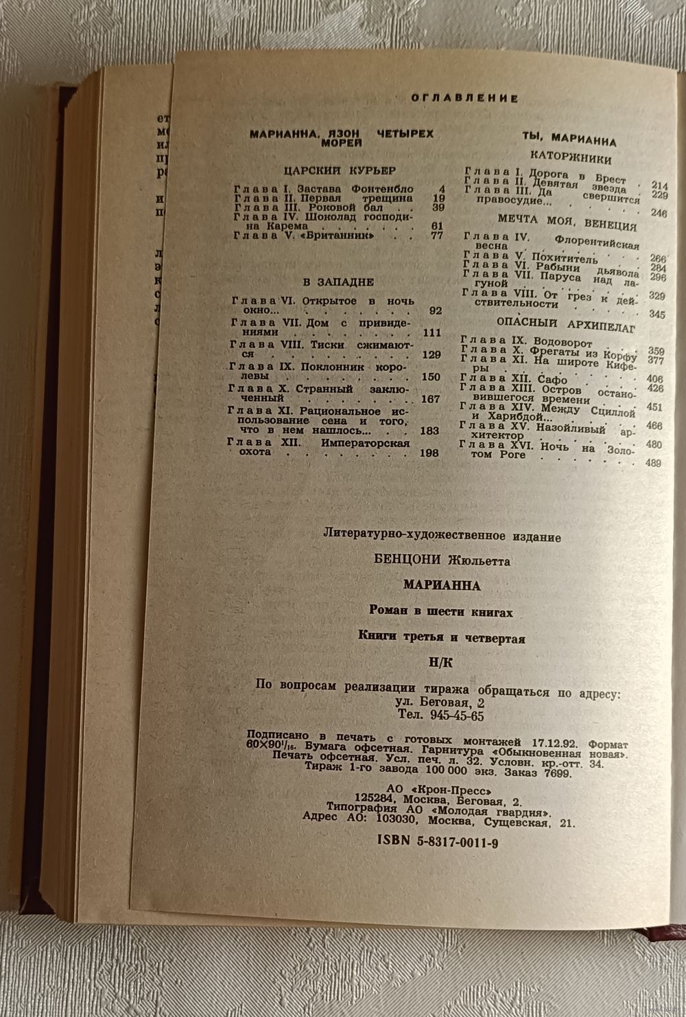 Бенцони Жюльетта. Марианна. Язон четырех морей. Ты, Марианна. Кн. 3 и 4. М.: Крон-Пресс, «Преображение», 1992. — 512 с., суперобложка.