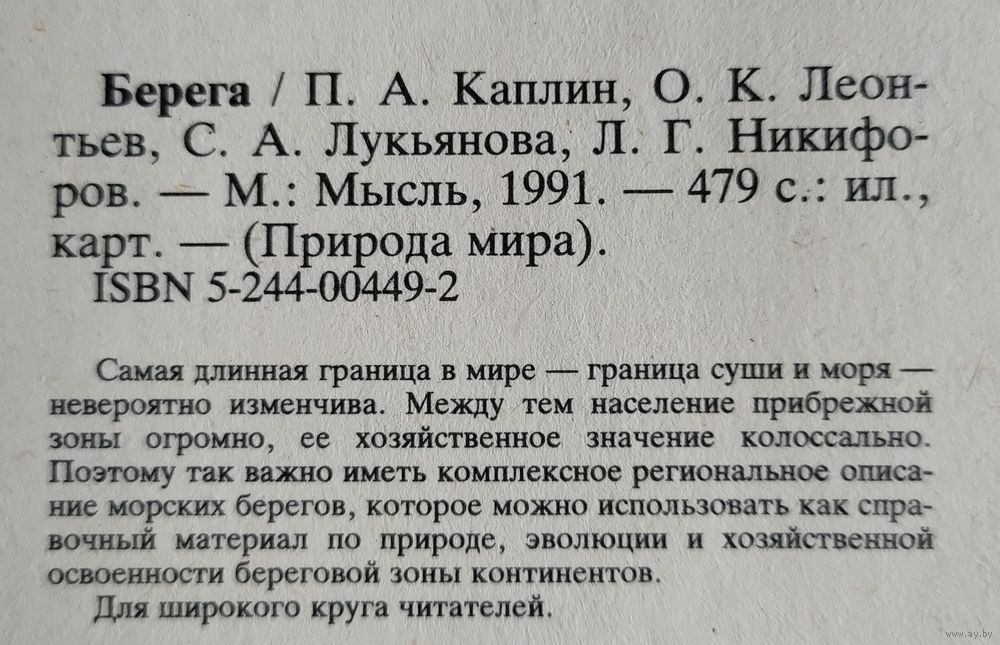 Каплин П.А., Леонтьев, О.К. Лукьянов С.А., Никифоров Л.Г. Берега. Серия: Природа мира. Художник серии Д.Ф. Шканов. Оформление тома А.И. Ольденбургера. Художник-картограф А.В. Макарова. М.: Мысль, 1991г., 480 с., цв. илл., фото, карт. Твёрдый переплёт, энциклопедический формат. (ISBN: 5-244-00449-2 / 5244004492).
