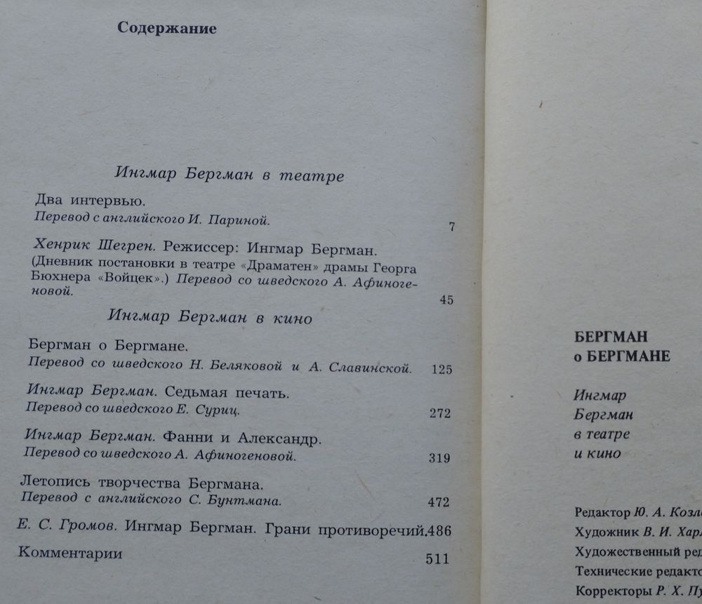 Тираж 30000 экз. 528 стр. В книге отражены разные стороны творчества Бергмана-режиссера. Представлены его интервью, посвященные работе в театре и кино, его творческим установкам. Подробная летопись творчества режиссера, а так же два его киносценария: "Седьмая печать", "Фанни и Александр".