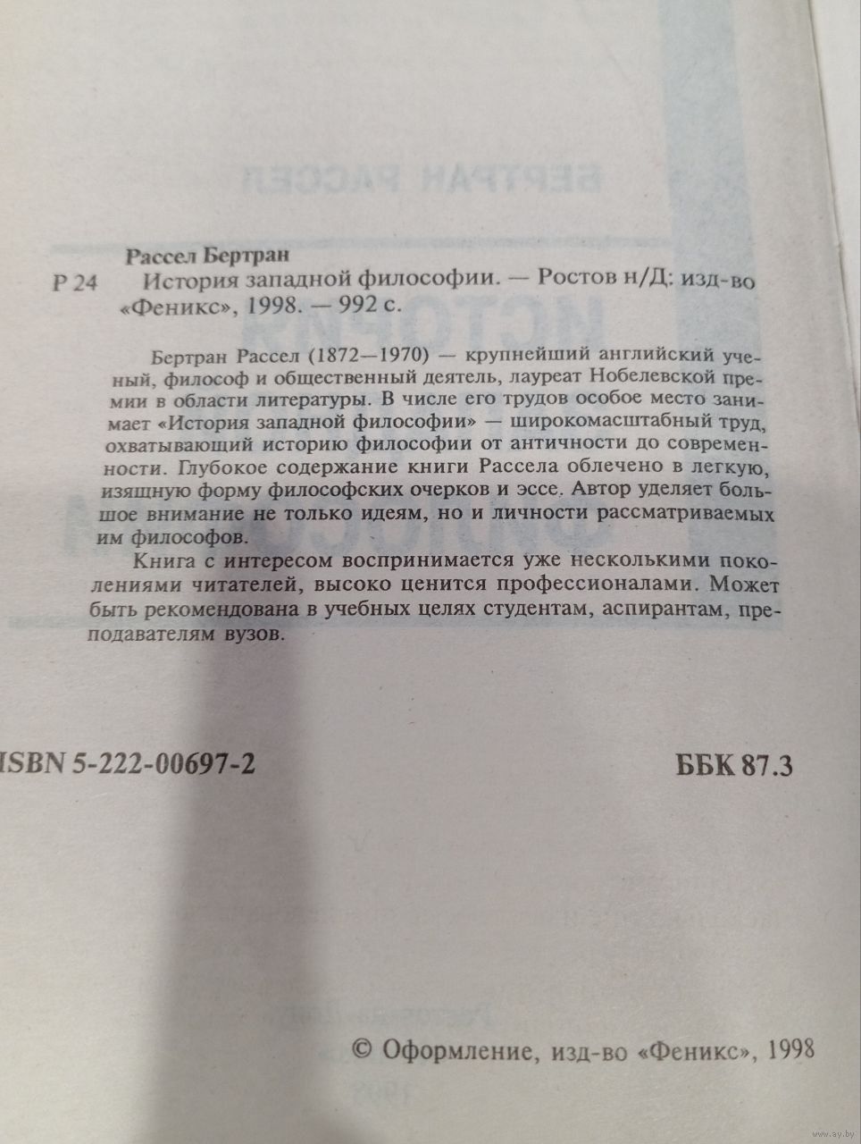 Книга Бертрана Рассела "История западной философии" — фундаментальный труд крупнейшего английского ученого, философа и общественного деятеля, лауреата Нобелевской премии по литературе . Это одна из самых известных и читаемых работ по истории философской мысли, в которой автор излагает развитие западной философии от досократиков до логического анализа XX века. Издание 1998 года, издательство "Феникс" (Ростов-на-Дону), серия "Выдающиеся мыслители" .