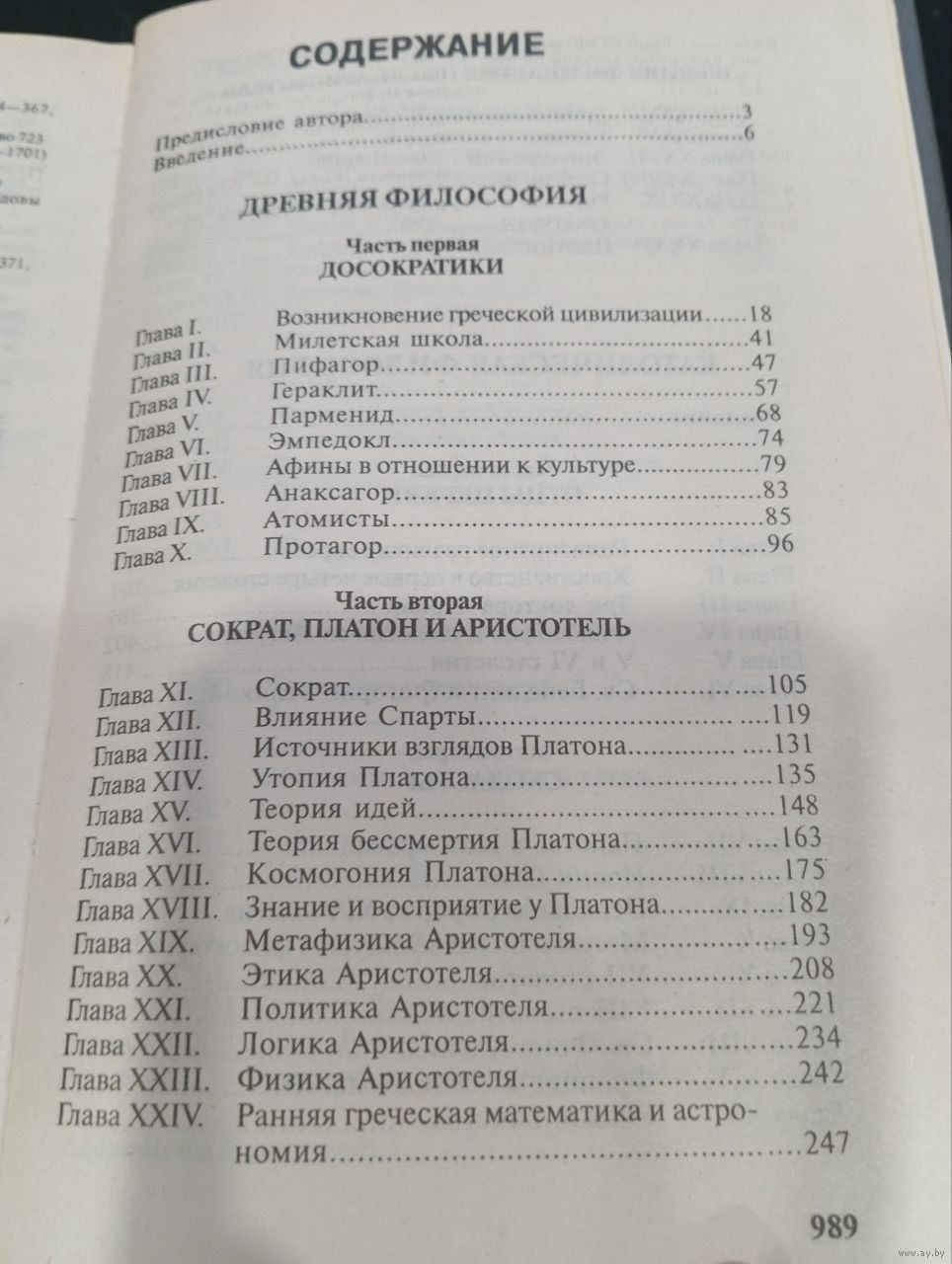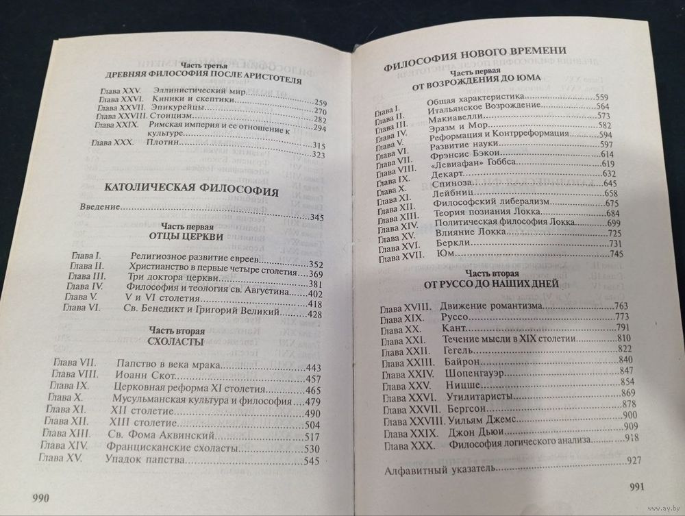 Труд состоит из трех книг: первая посвящена античной философии (досократики, Сократ, Платон, Аристотель), вторая — католической философии (от отцов церкви до схоластов), третья — философии Нового времени (от Возрождения до Джона Дьюи и философии логического анализа) .