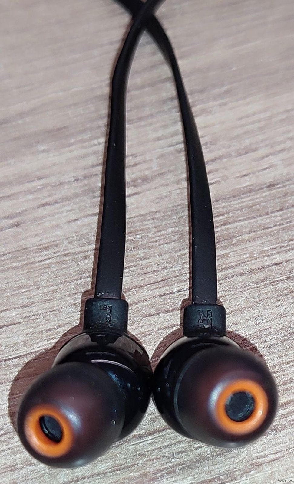 Беспроводные bluetooth наушники JBL TUNE 110BT чёрного цвета. Между собой соединены кабелем. Довольно неплохой громкий звук с басами, есть микрофон. Родные резинки. В рабочем состоянии светится голубой диод (фото №5). Заглушка для зарядки была из двух составных частей, чёрная отвалилась, но резинка держится нормально (фото №6). Потерялась панелька для включения/выключения и регулировки звука (фото №7), включить наушники и регулировать громкость можно любым тоненьким предметом, а также, звуком можно управлять с соединённого устройства. Дополнительный комплект резинок и фирменный оригинальный кабель JBL для зарядки в комплекте (фото №9)