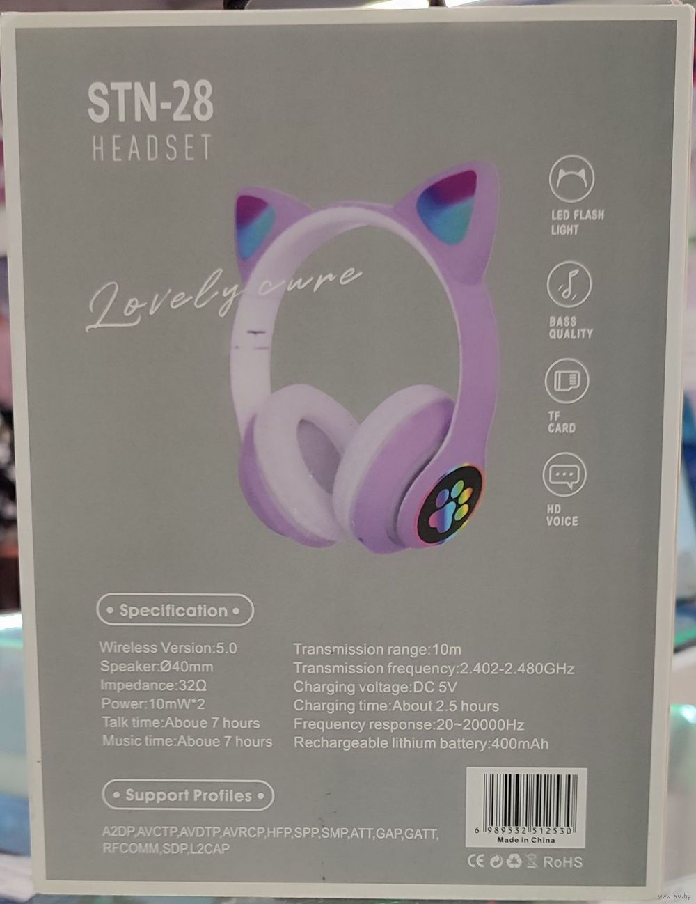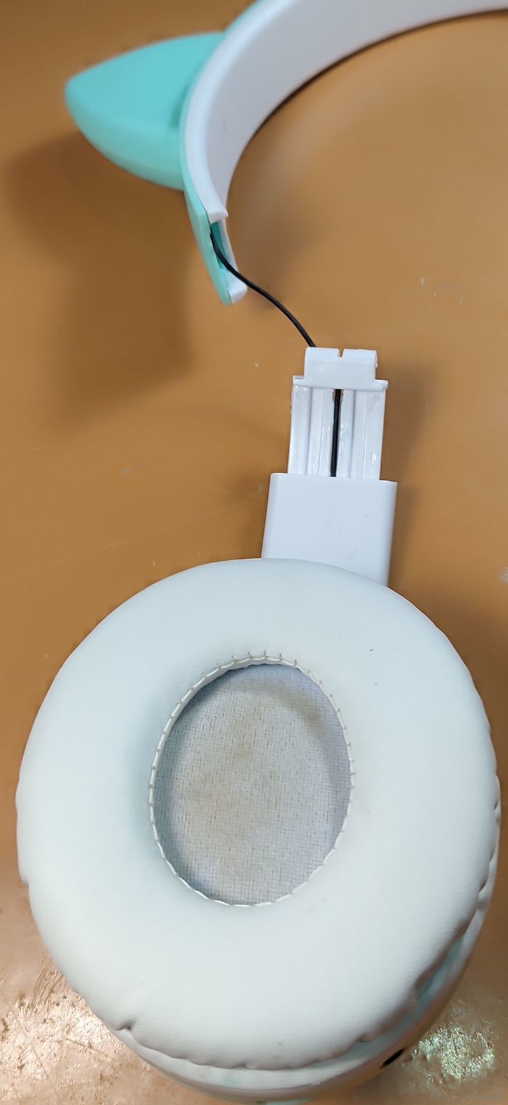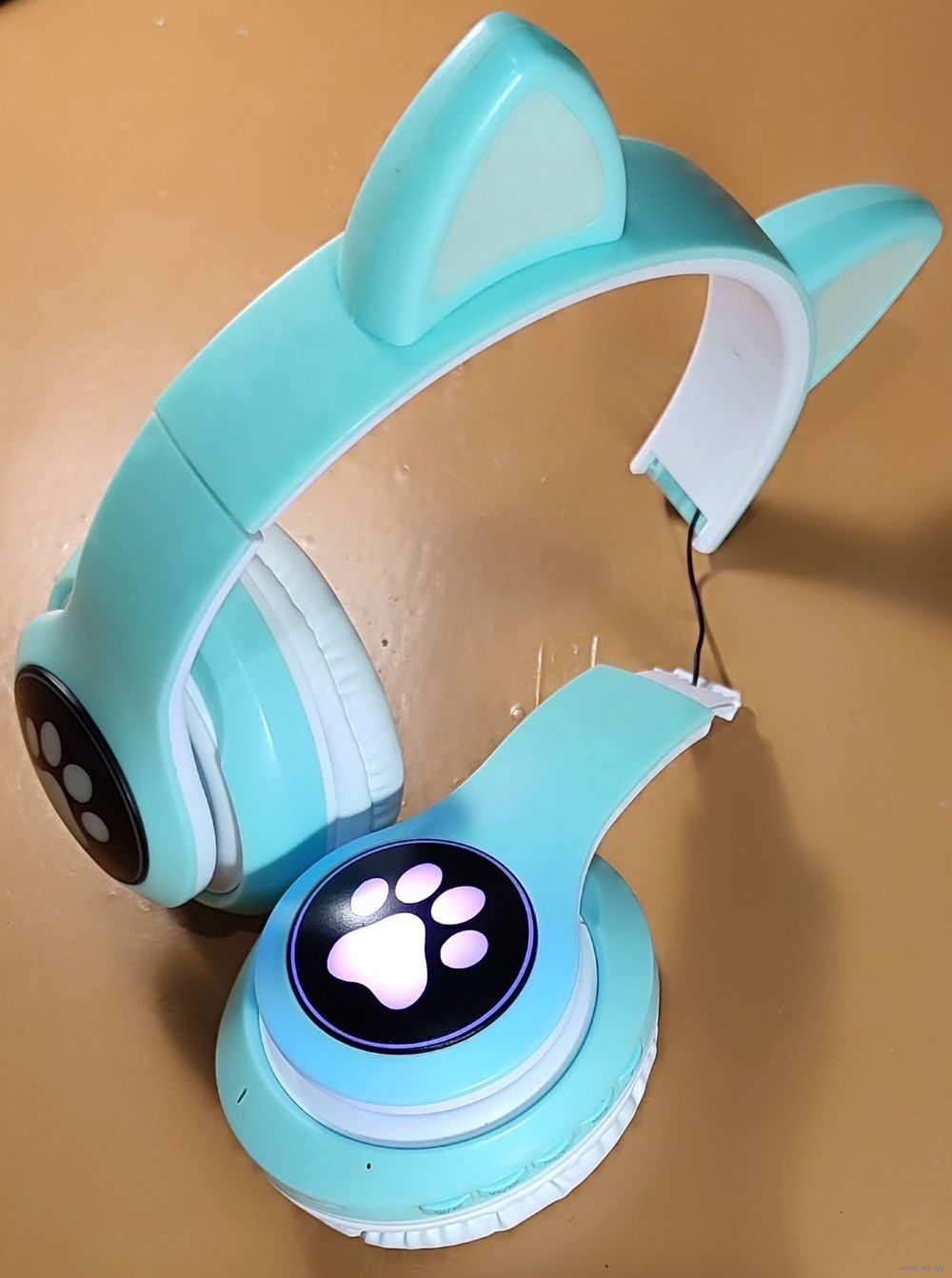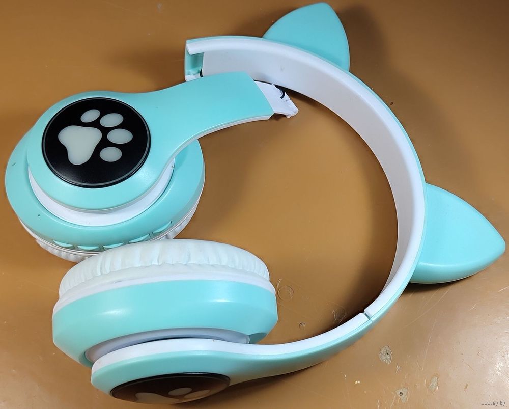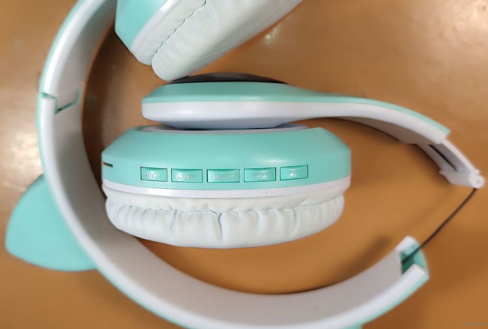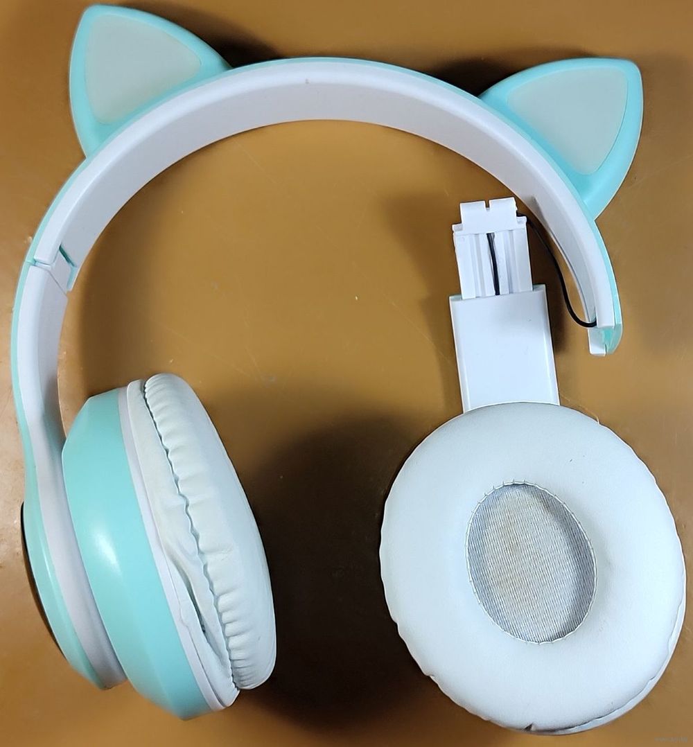 Беспроводные наушники-ушки с микрофоном STN-28 бирюзового цвета. Сломана дужка, но оба динамика рабочие и звук идёт, а вот фонарики моргают только на сломанной части, коробки нету