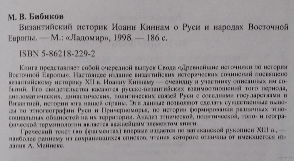 Бибиков М.В. Византийский историк Иоанн Киннам о Руси и народах Восточной Европы: Тексты, перевод, комментарий. Серия: Древнейшие источники по истории Восточной Европы. Институт всеобщей истории РАН. М. Ладомир 1997г. 186 с. Твердый переплет. Увеличенный формат.