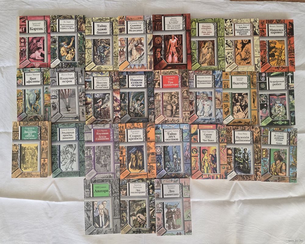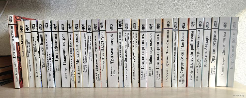 Библиотека приключений и фантастики. В.И. Суханов Аватара, Э. Скобелев Пацаны купили остров, Вайнеры Эра милосердия,В. Беляев Старая крепость, А. Якимович Эльдорадо просит помощи, В.А. Обручев Плутония, Земля Санникова. И. Ефремов Сердце Змеи, Час Быка. Янка Мавр Полесские робинзоны, В стране райской птицы, Амок. А. Толстой Аэлита, Гиперболоид инженера Гарина, М. Лыньков Миколка-паровоз. В. Гигевич Марсианское путешествие. В. Шитик Подставка. Г.Адамов Тайна двух океанов. В. Каверин Два капитана. Д.Ф. Купер Последний из могикан. Л. Вельскопф-Генрих Сыновья Большой Медведицы. А. Дюма Три мушкетера, Двадцать лет спустя. Ж. Верн Плавучий остров. Ю Брайдер, Н. Чадович Поселок на краю Галактики. Я. Ларри Необыкновенные приключения Карика и Вали. А. Рыбаков Кортик. П. Мисько Грот афалины. Тайна одной башни.