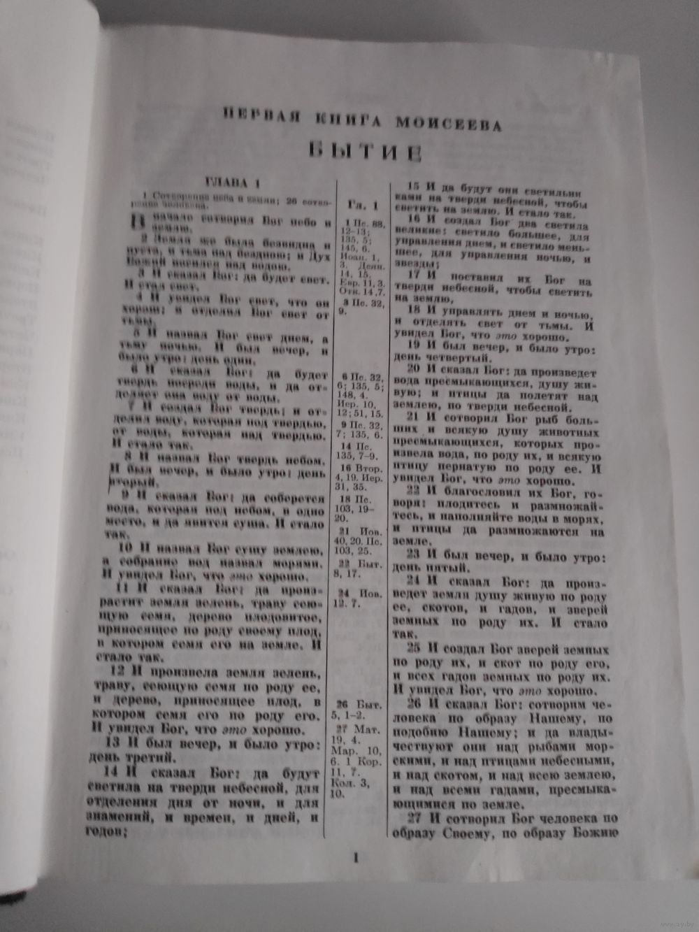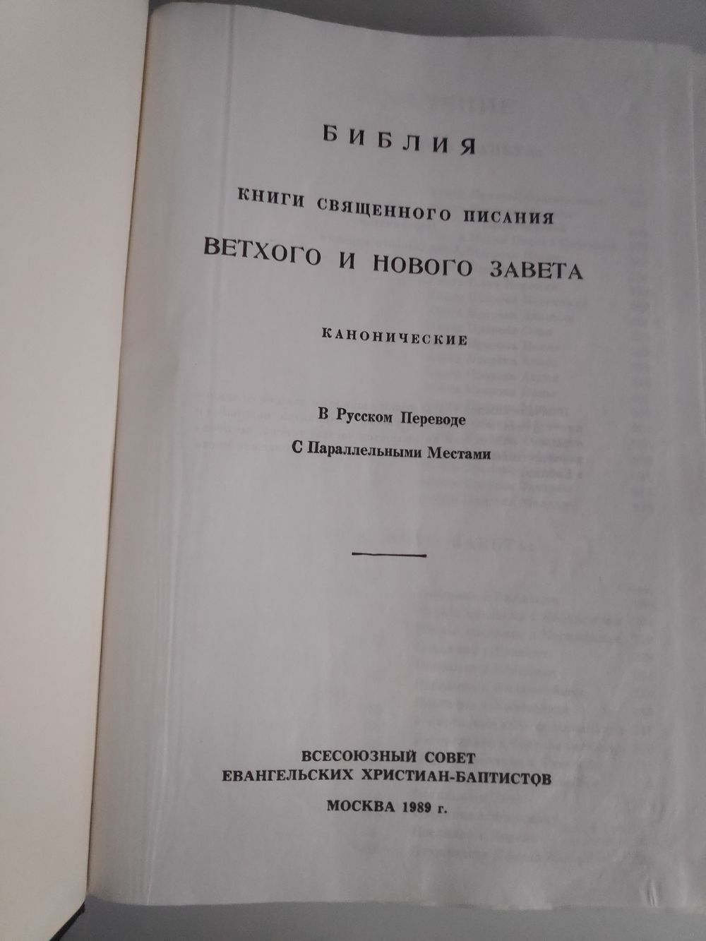 Это издание Библии, выпущенное в 1989 году в Москве Всесоюзным советом евангельских христиан-баптистов. Книга включает канонические книги Ветхого и Нового Завета, переведенные на русский язык и снабженные параллельными местами. Издание соответствует протестантскому канону Библии, который насчитывает 66 книг.