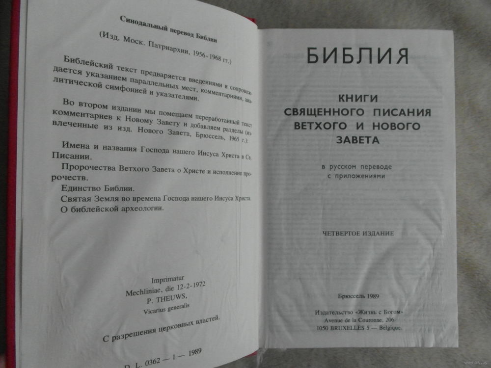 Библия. Книги Священного Писания Ветхого и Нового Завета. В русском переводе с приложениями. Брюссель Жизнь с Богом. 1989 г.