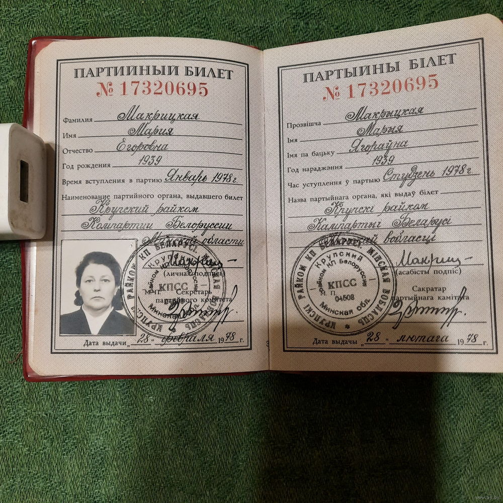 Билет члена КПСС Макрицкой М.Е.1939 г.рожд. с выплаченными членскими взносами с 01.1978 по 09.1990гг.