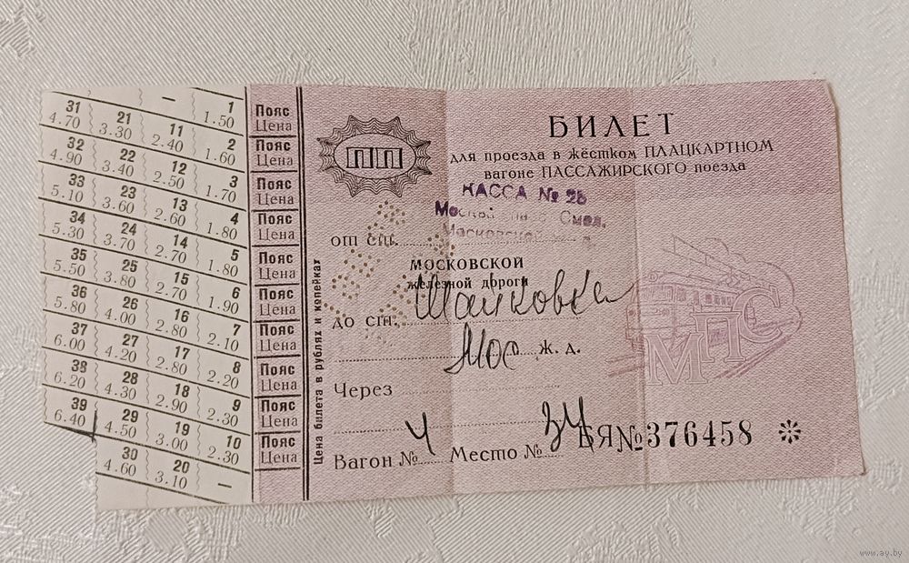 Это билет для проезда в жёстком плацкартном вагоне пассажирского поезда Московской железной дороги. На нём указаны номер поезда, номер вагона, место и номер билета.