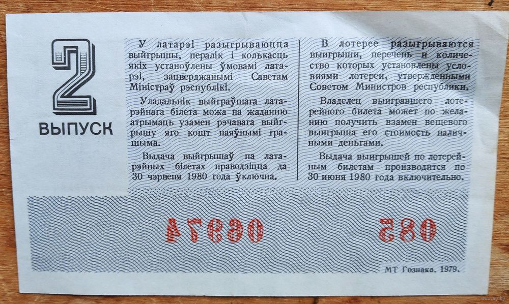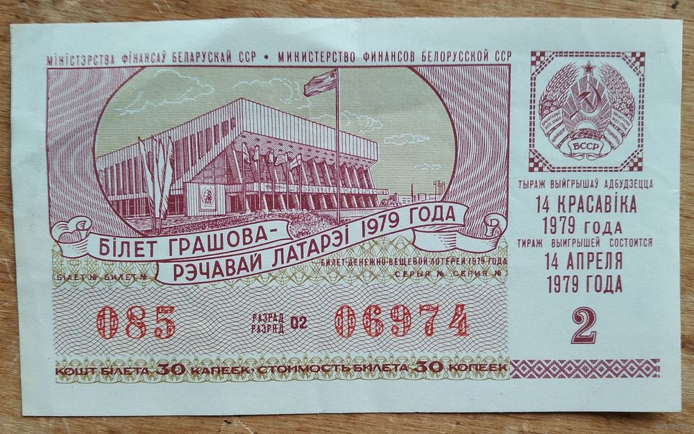 Бiлет грашова-рэчавай латарэi. 14 красавіка 1979 г. Билет денежно-вещевой лотереи. 14 апреля 1979 г.
