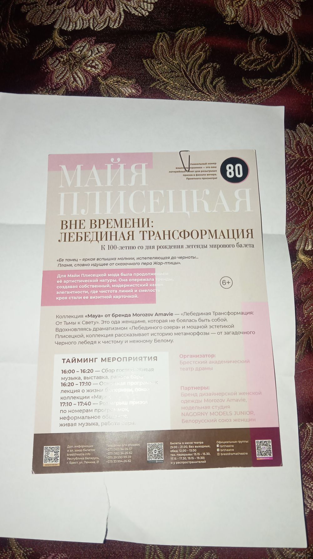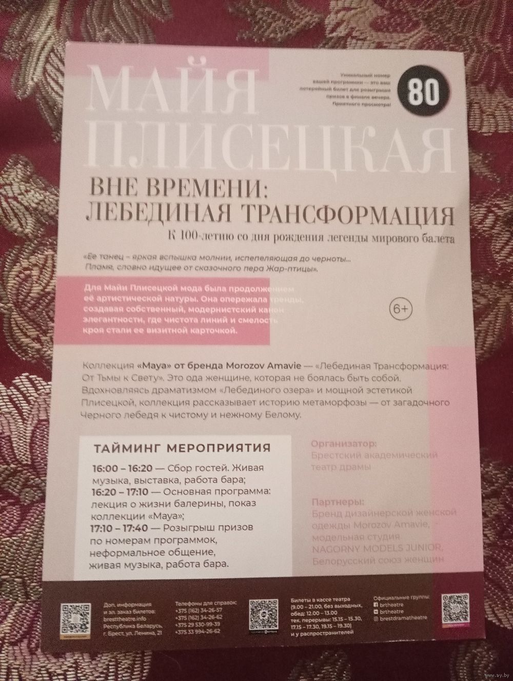 На изображении представлена афиша мероприятия под названием «Майя Плисецкая. Вне времени: Лебединая трансформация», приуроченного к 100-летию со дня рождения легенды мирового балета. Мероприятие проходило в Брестском академическом театре драмы и включало в себя лекцию о жизни балерины и презентацию одноименной коллекции одежды от бренда Morozov Amavie. О мероприятии