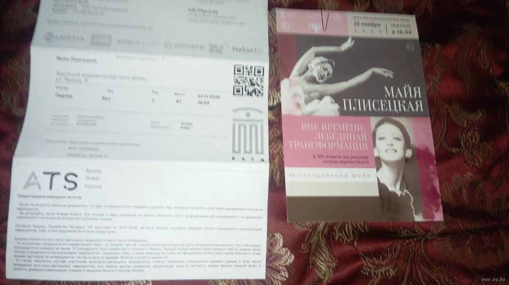 на изображениях показаны билет и программка на мероприятие под названием «Майя Плисецкая. Вне времени: Лебединая трансформация». Детали мероприятия