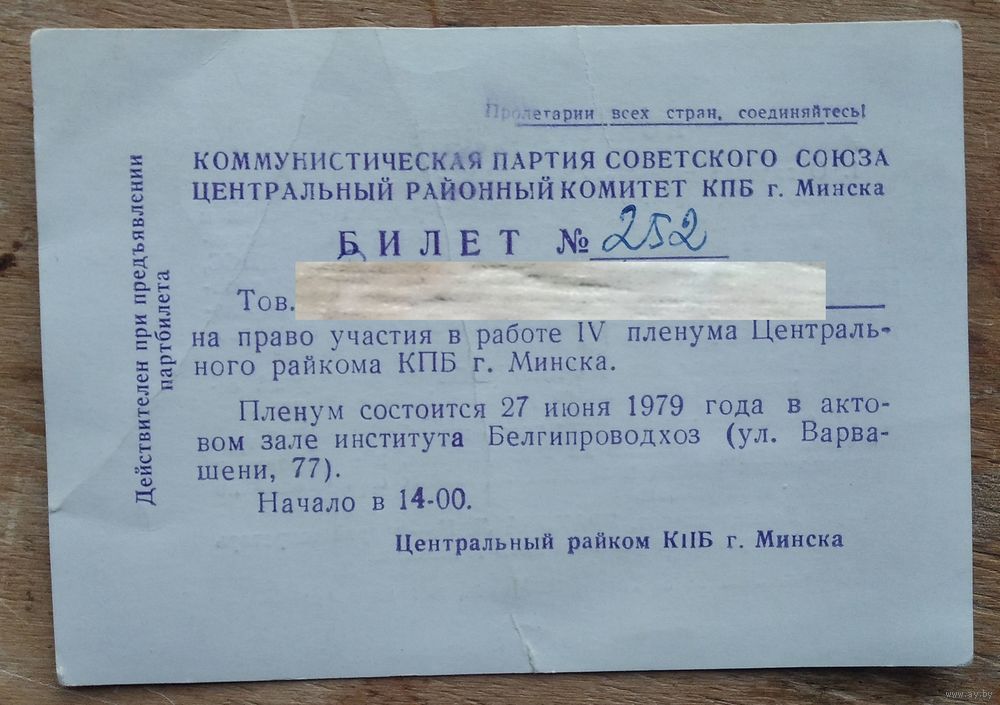 Билет на право участия в работе Пленума Центрального райкома КПБ. г.Минска. 1979 г.