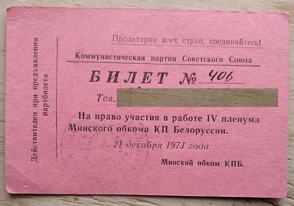 Билет на право участия в работе пленуме Минского обкома КП Белоруссии. 1971 г.