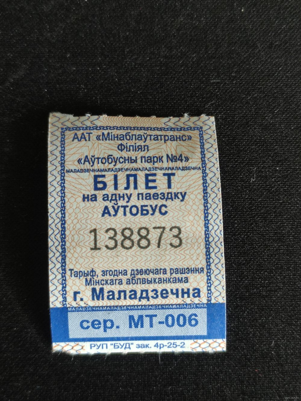Талон реализован кондуктором в городском автобусе г. Заславль. Перевозчик - Автобусный парк №4 г. Молодечно.