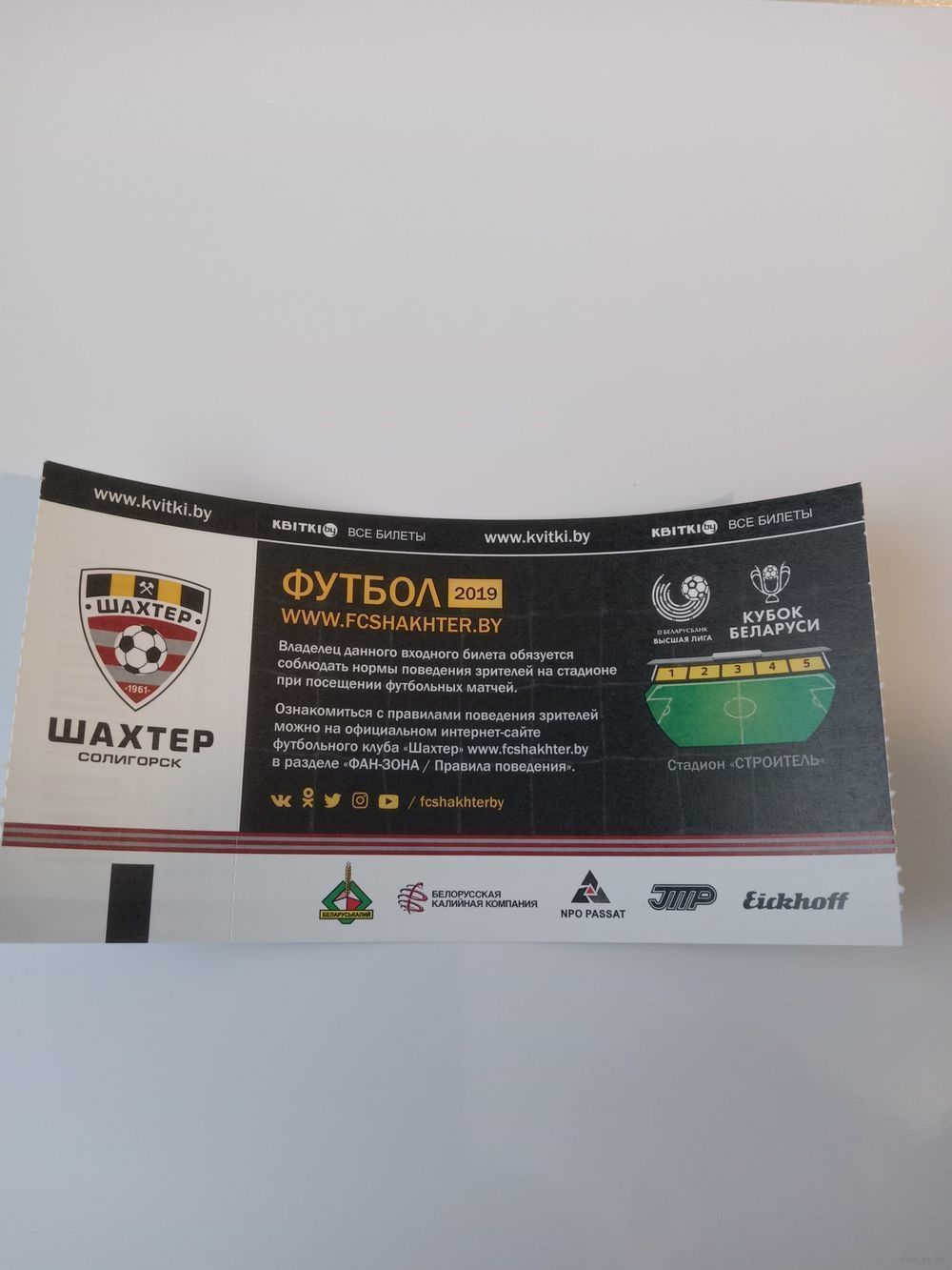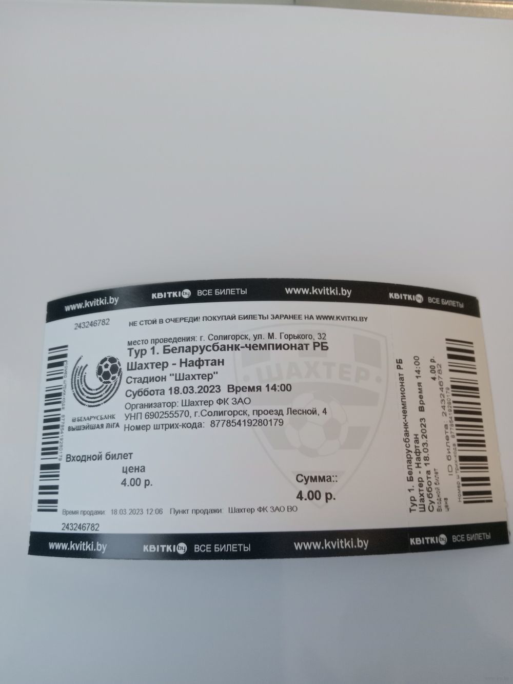 Билет с матча Шахтер (Солигорск) VS Нафтан (Новополоцк), 18 марта 2023 года.