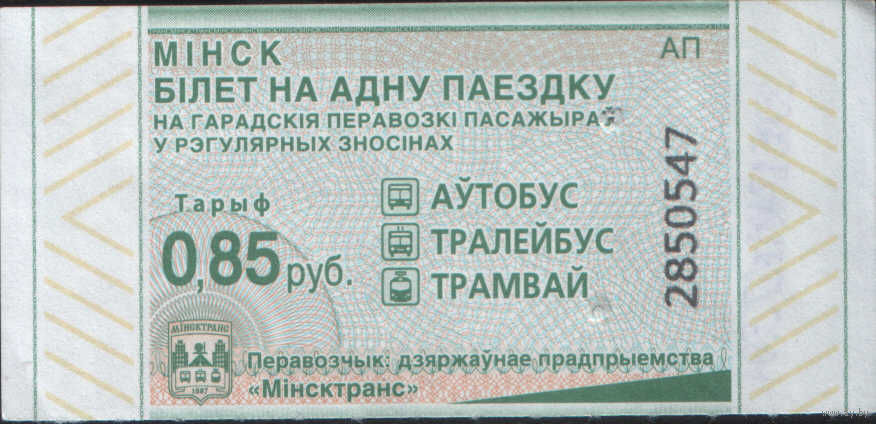 Билет - Талон б/у - Минск 0,85 к. (зак. 104ц - 2023)