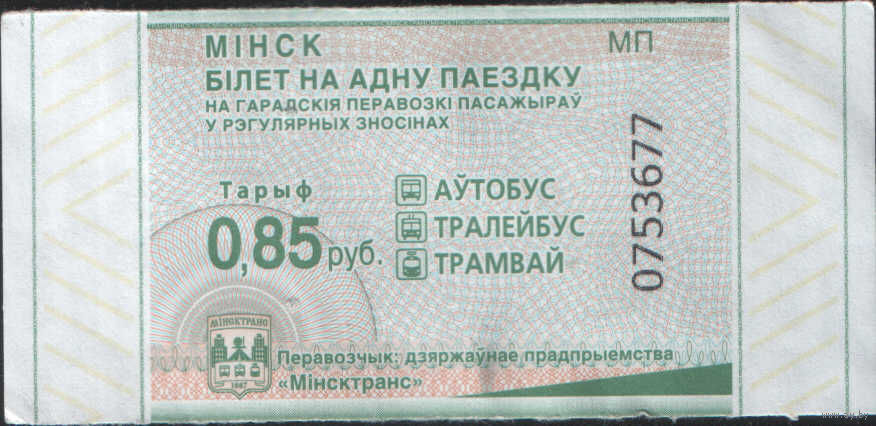 Билет - Талон б/у - Минск 0,85 к. (зак. 634ц - 2023)