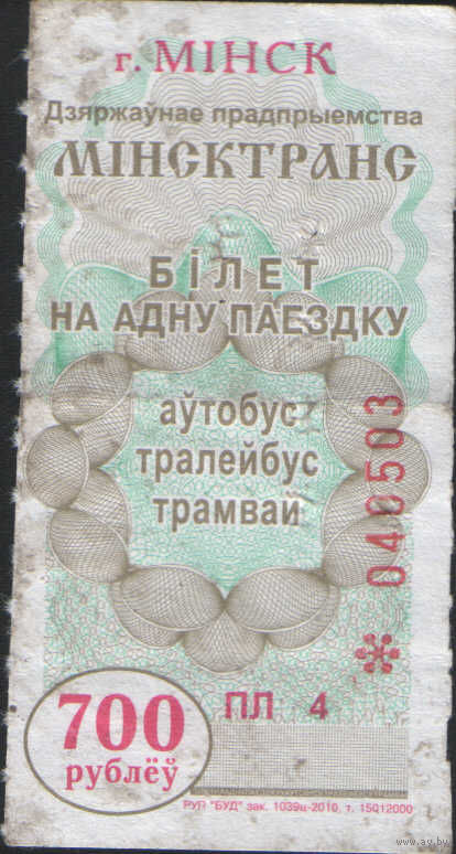 Билет - Талон б/у - Минск 700 р. (зак. 1039ц - 2010)