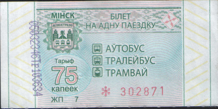 Билет - Талон б/у - Минск 75 к. (зак. 729ц - 2020)