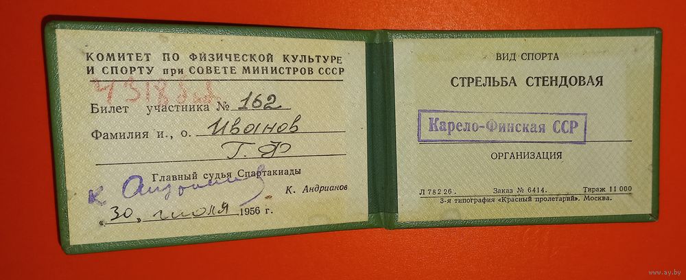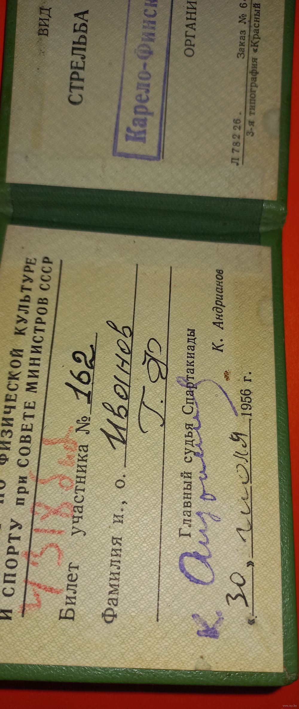 Билет участника спартакиады СССР1956(КАРЕЛО ФИНСКАЯ(А40)