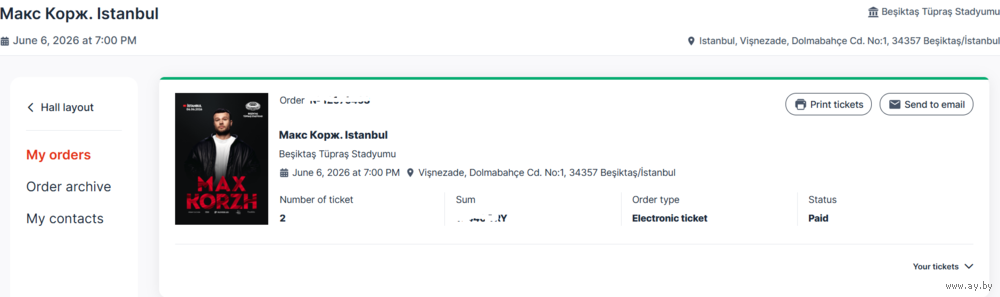 В наличии 2 билета на концерт в Стамбуле 06.06.26 (Стадион Бешикташ)