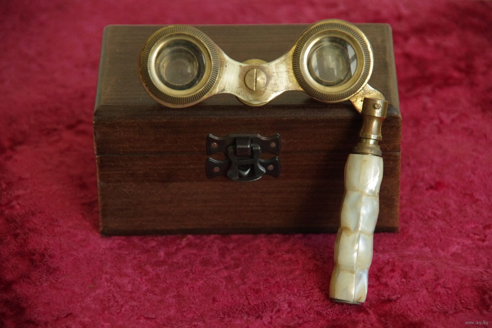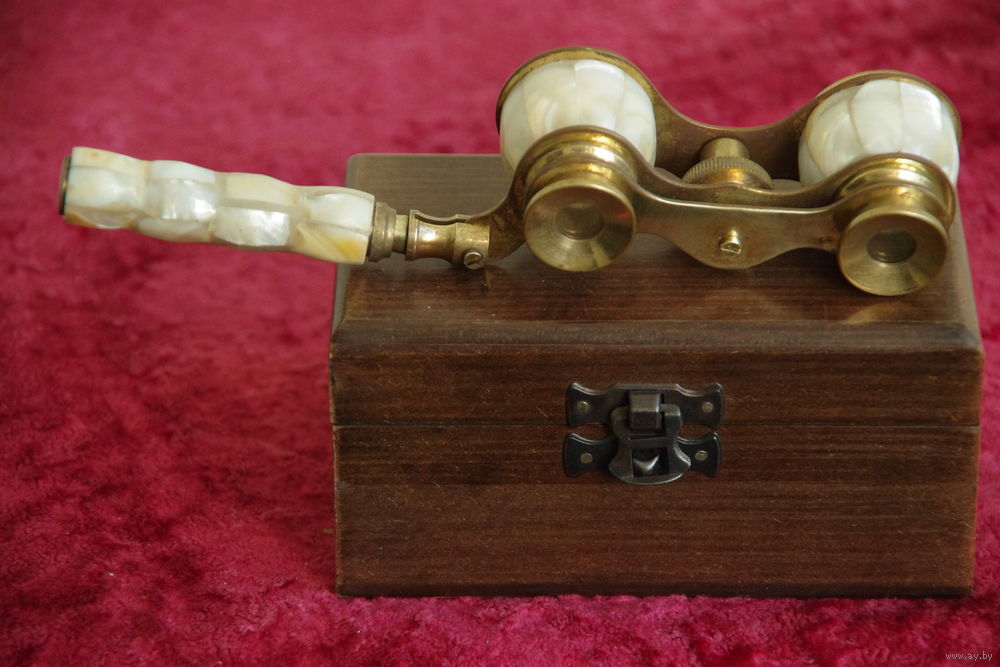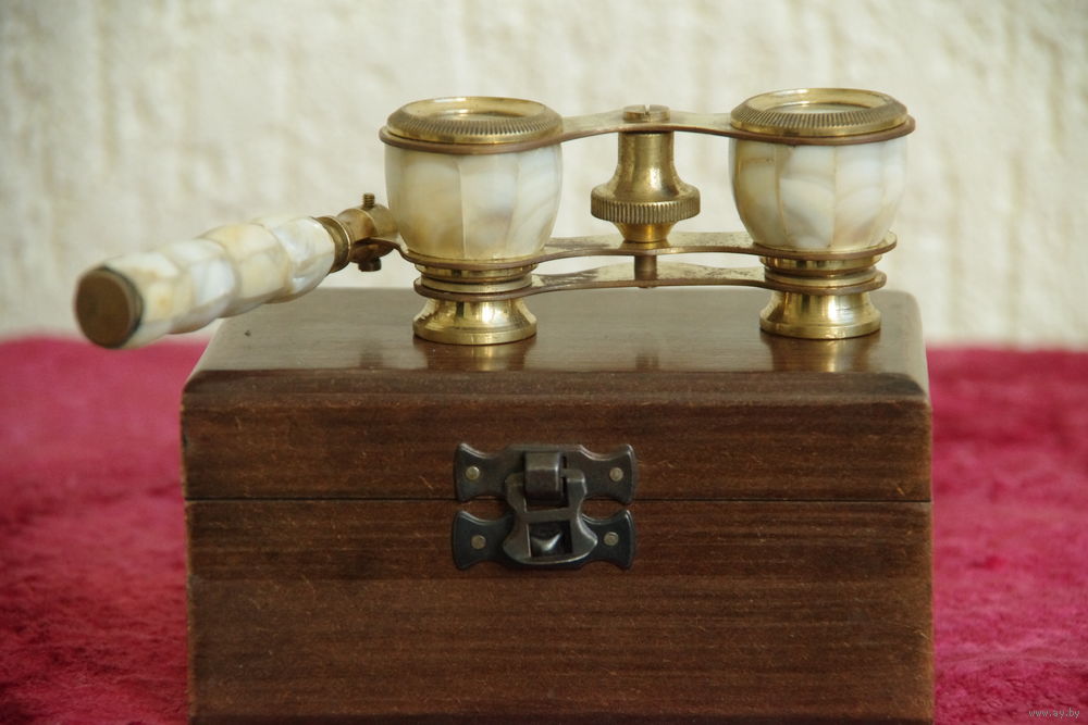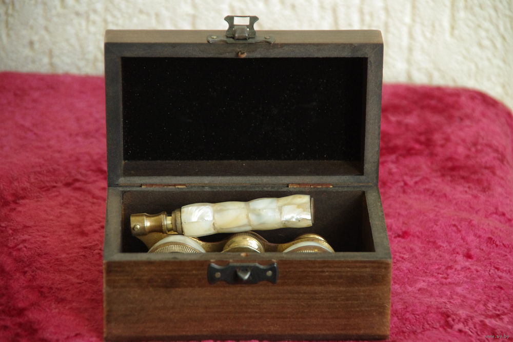 Бинокль старинный , латунный с перламутровой инкрустацией в футляре ( рабочий )
