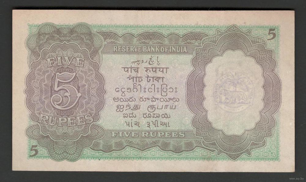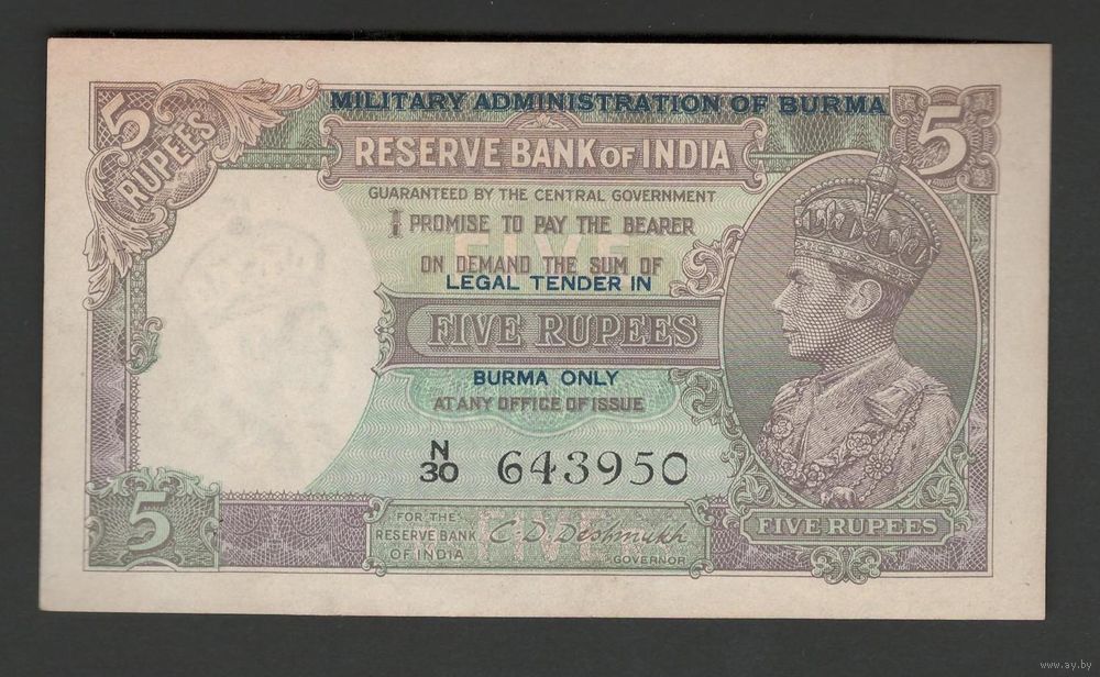 Бирма 5 рупий 1945 года. Тип Р-26b. Подпись Deshmukh. Состояние XF+/aUNC