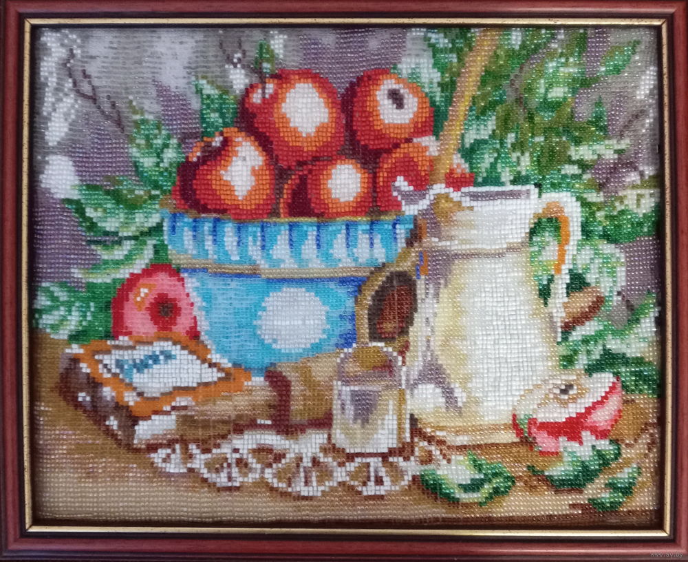 Эта работа сделана во второй половине 20 века. Ткачество бисером. Работа в раме. Размер 30 см на 24см.