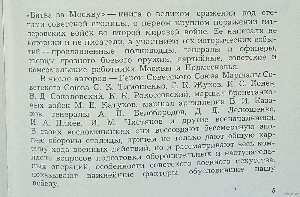 Аннотация издательства: «Битва за Москву» — книга о великом сражении под стенами советской столицы, о первом крупном поражении гитлеровских войск во второй мировой войне. Ее написали не историки и не писатели, а участники тех исторических событий — прославленные полководцы, генералы и офицеры, творцы грозного боевого оружия, партийные, советские и комсомольские работники Москвы и Подмосковья. В числе авторов — Герои Советского Союза Маршалы Советского Союза С. К. Тимошенко, Г. К. Жуков, И. С. Конев, В. Д. Соколовский, К. К. Рокоссовский, маршал бронетанковых войск М. Е. Катуков, маршал артиллерии В. И. Казаков, генералы А. П. Белобородое, Д. Д. Лелюшенко, И. А. Плиев, И. М. Чистяков и другие военачальники. В своих воспоминаниях они воссоздают бессмертную эпопею обороны столицы, причем не только дают общую картину хода военных действий, но и рассматривают весь комплекс вопросов подготовки оборонительных и наступательных операций, особенности советского военного искусства, показывают важнейшие факторы, обусловившие нашу победу. Вся Советская страна, весь двухсотмиллионный советский народ защищали свою столицу. Плечом к плечу стояли насмерть у стен Москвы представители всех народов нашей социалистической Родины. Велики заслуги трудящихся Москвы и Подмосковья в обороне столицы. О массовом героизме на фронте и в тылу, о делах москвичей и трудящихся Подмосковья, ковавших оружие для фронта, вспоминают В. П. Пронин, Б. Н. Черноусов, Н. В. Попова, дважды Герой Социалистического Труда И. А. Буянов, А. А. Сурков и другие. Душой обороны столицы была Московская партийная организация — один из передовых отрядов Коммунистической партии Советского Союза. Авторы воспоминаний рассказывают о разносторонней деятельности московских коммунистов, о мобилизации всех сил и средств на отпор врагу, о создании народного ополчения и партизанских отрядов, о перестройке работы промышленности и сельского, хозяйства на военный лад