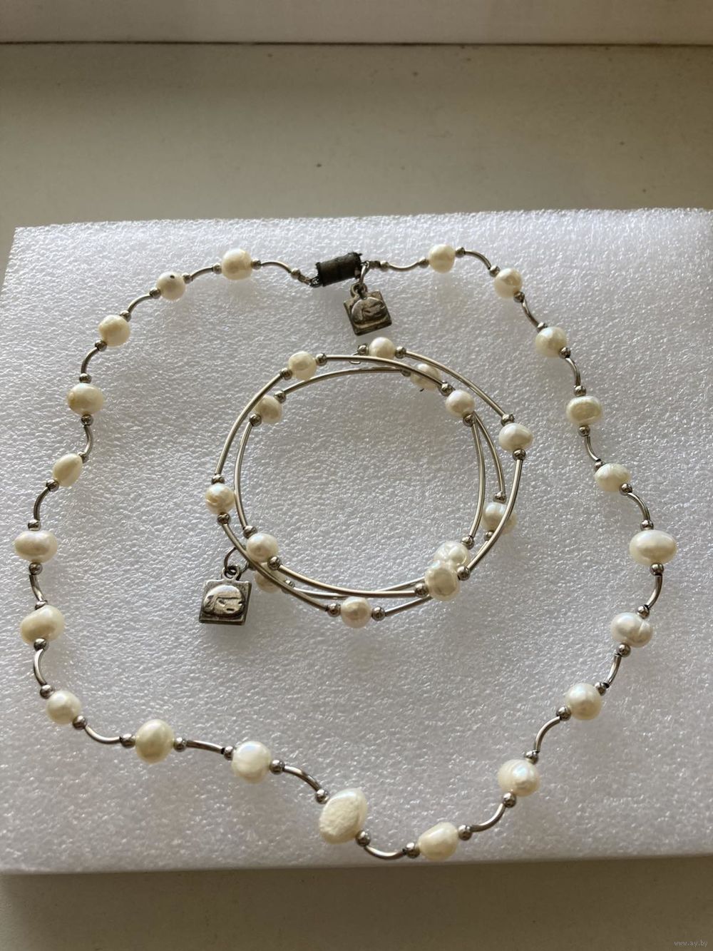 Бижутерия, комплект браслет и колье. Материал : бусины, имитация под жемчуг, и металлический каркас. В колье желательно отремонтировать застежку, закрывает, но иногда расстегивается. Можно купить по отдельности. Отправлю любой почтой.