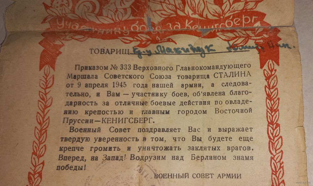 Благодарность Сталина за КЕНИГСБЕРГ(А47)
