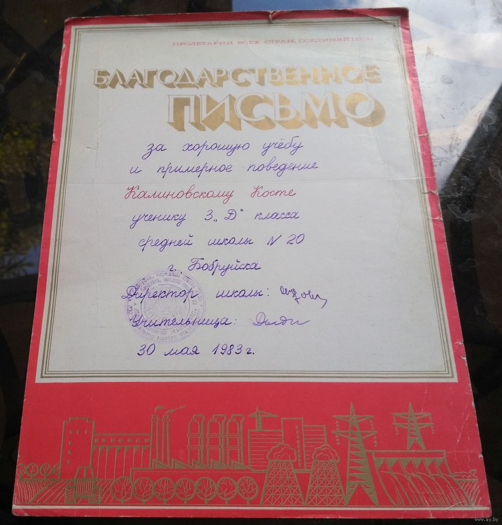 Благодарственное письмо Бобруйск 20-я школа 1983 год