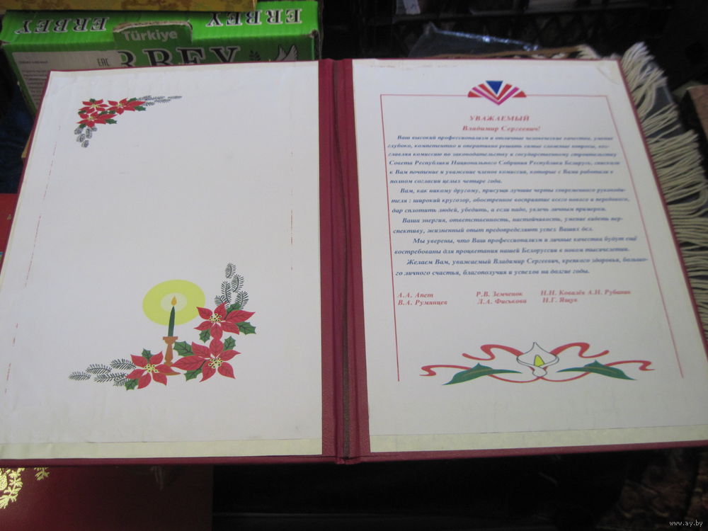 Благодарственное послание известному государственному деятелю БССР и РБ от членов комиссии Совета Республики Национального Собрания РБ . Торги!