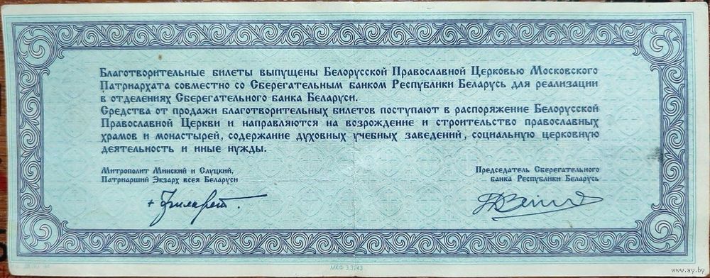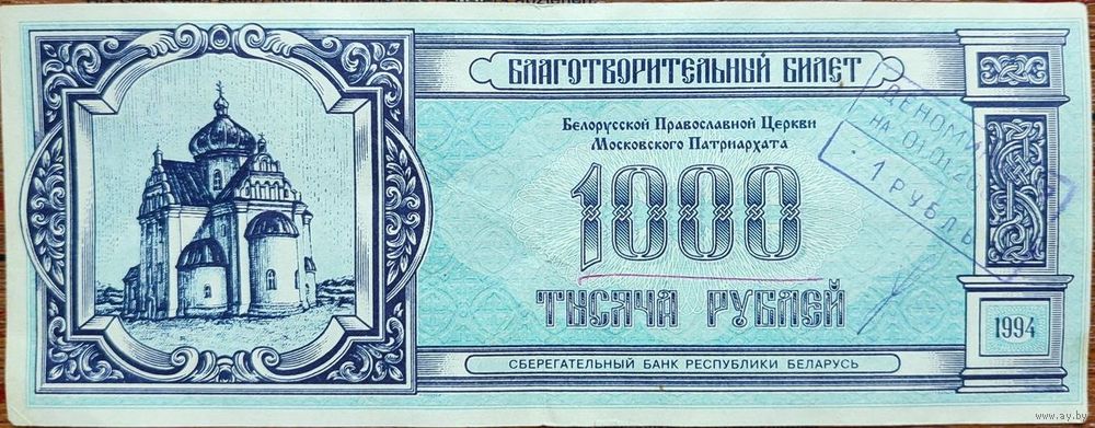 Благотворительный билет Белорусской Православной церкви Московского Патриархата на 1 000 рублей (после деноминации 01.01.2000г - 1р)