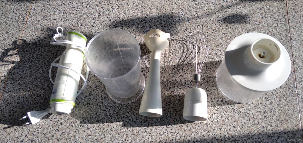 | Мотор и венчик рабочие. Измельчители не работают. Мерный стакан и ёмкость измельчителя целые. | |