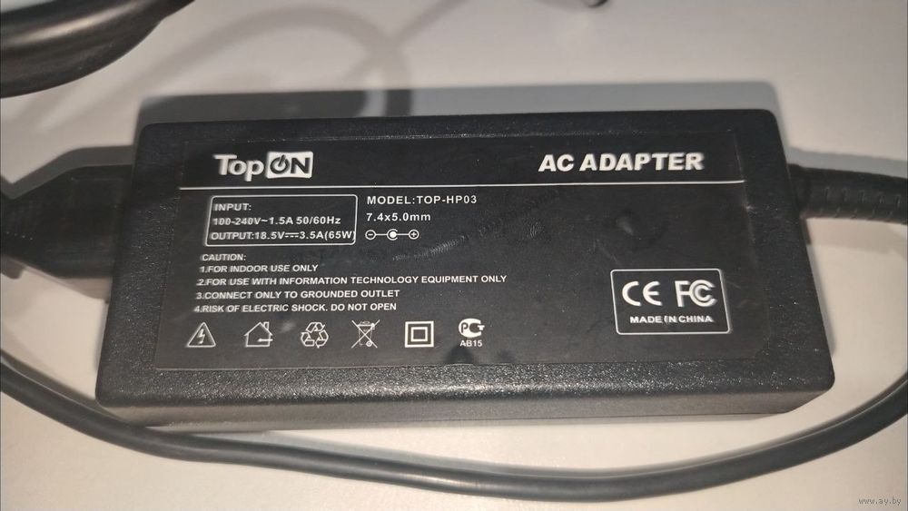 Это совместимый аналог оригинальных зарядок HP мощностью 65 Вт. Его основные характеристики: выходное напряжение 18.5V, сила тока 3.5A и штекер размером 7.4 x 5.0 мм (с центральным контактом внутри).