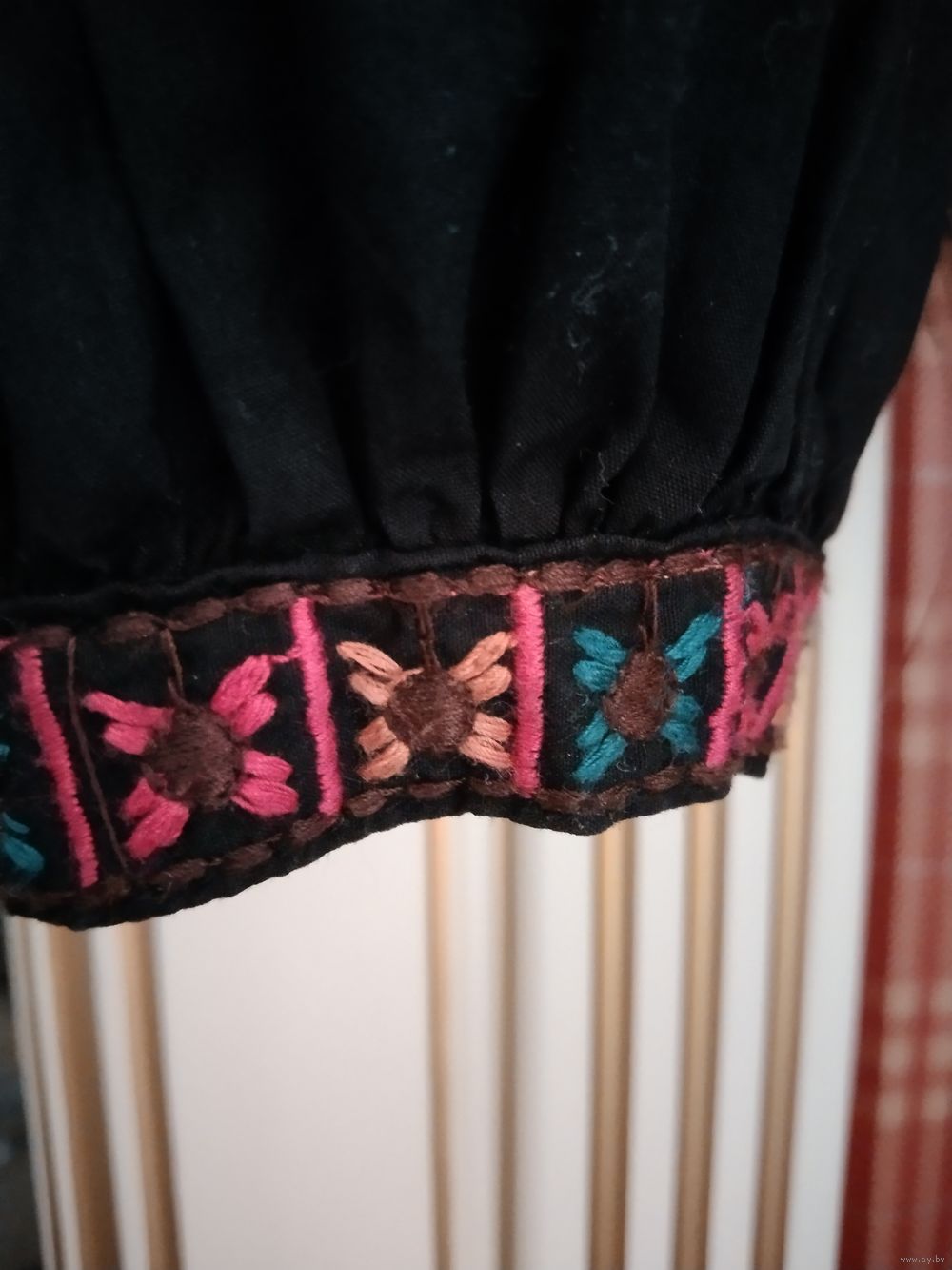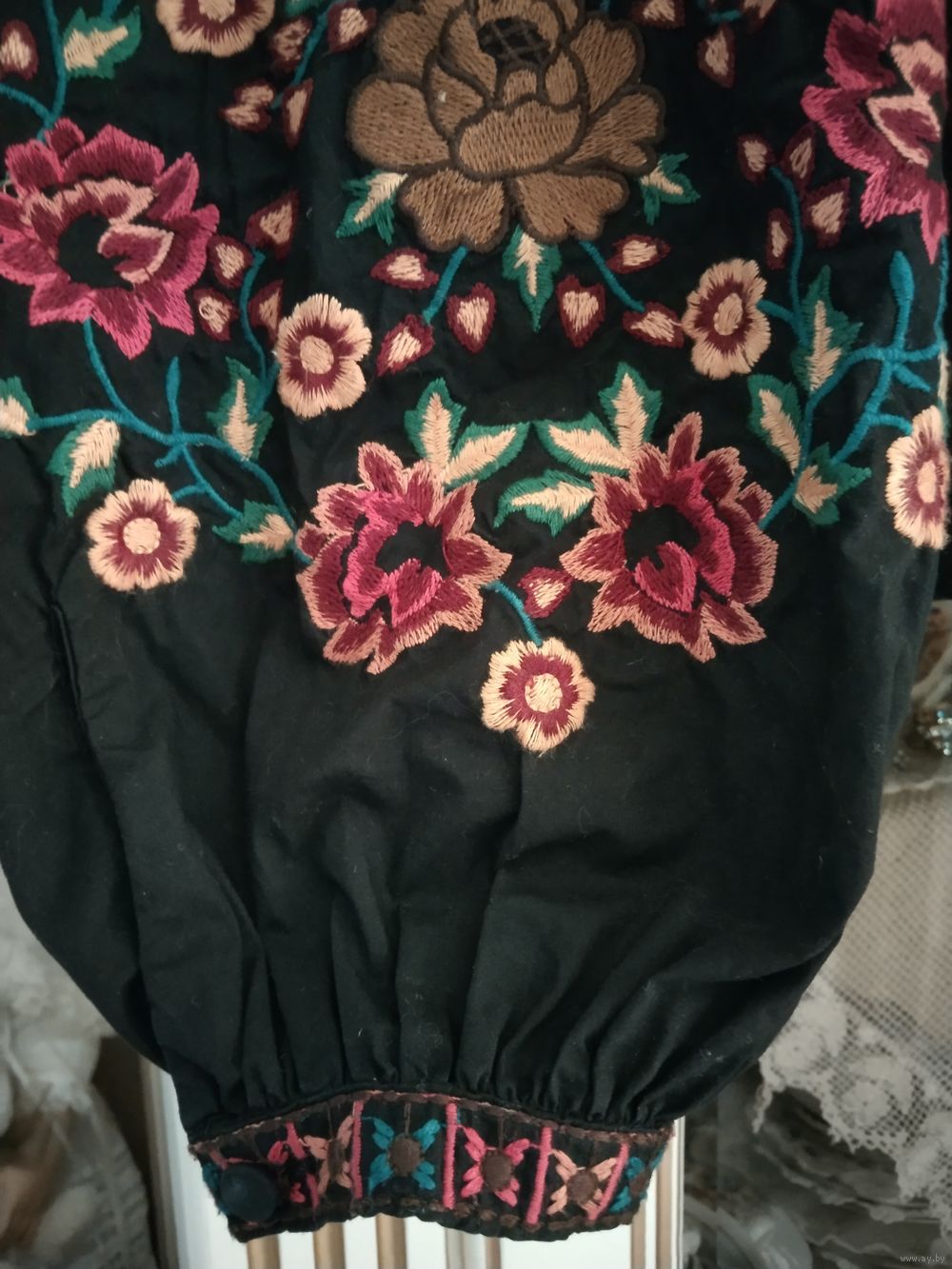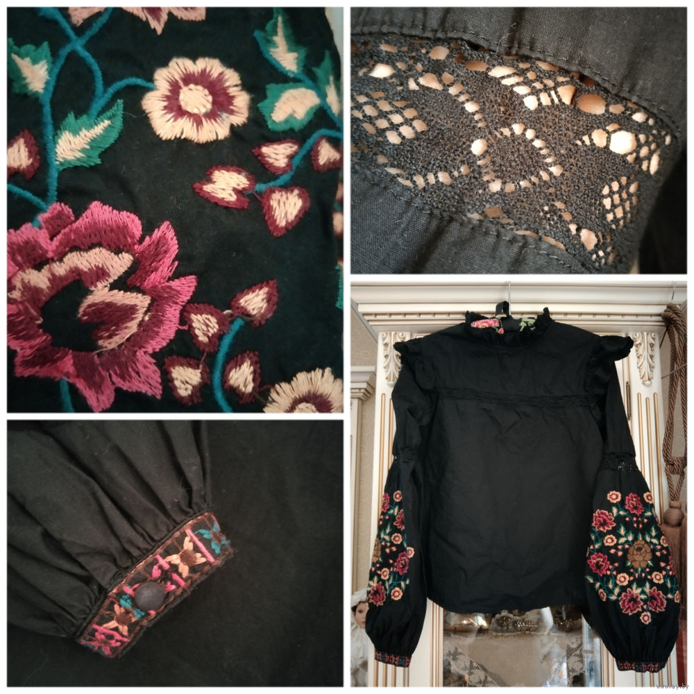 Оригинальная блузка с яркой вышивкой , рюшами и плетёным в ручную кружевом из хлопка на рукавах и груди, обтянутыми тканью пуговичками на вышитых манжетах.