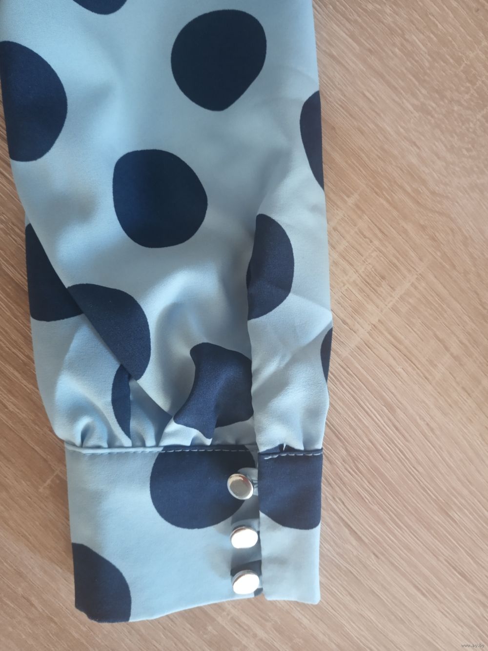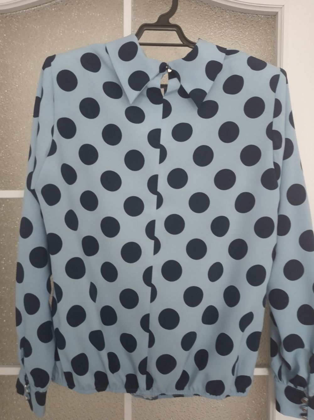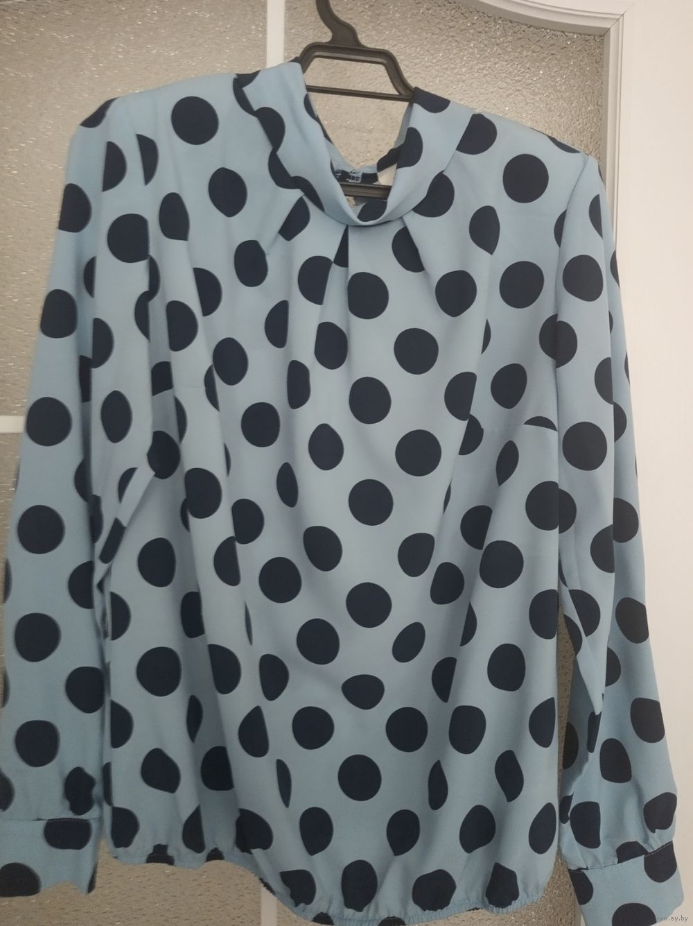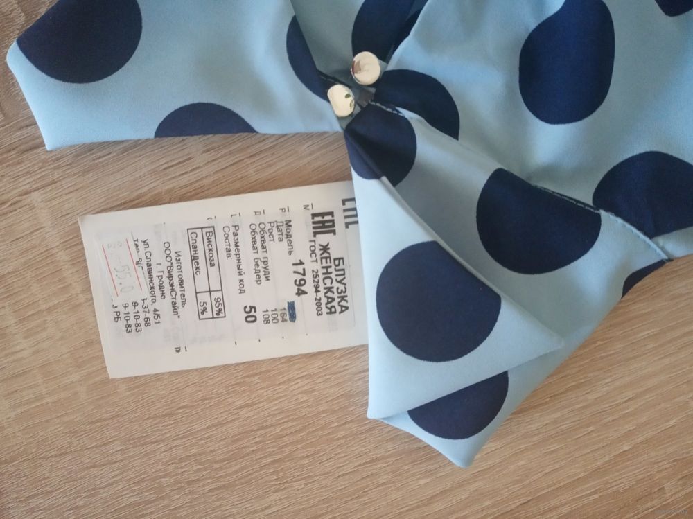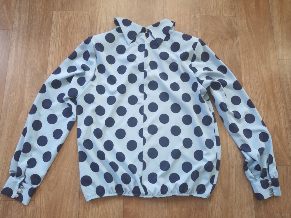 Блузка женская размер 50, основной цвет голубой в крупные темно- синие горохи. Длина изделия 60см, длина рукава от плеча 60см, обхват груди 100, обхват бедер 108, рост 164. Состав вискоза 95%, спандекс 5%. Производство РБ. Состояние новое.