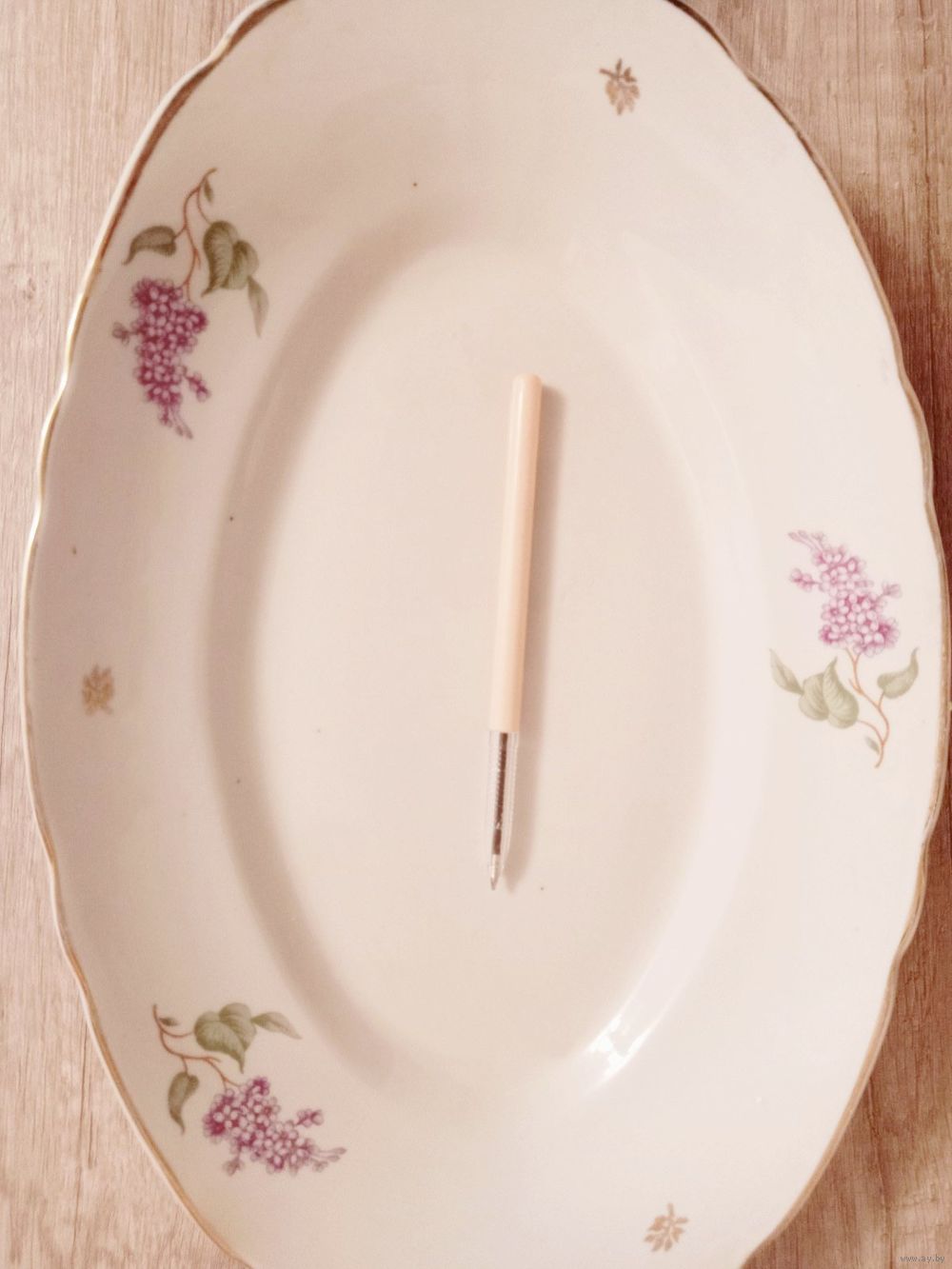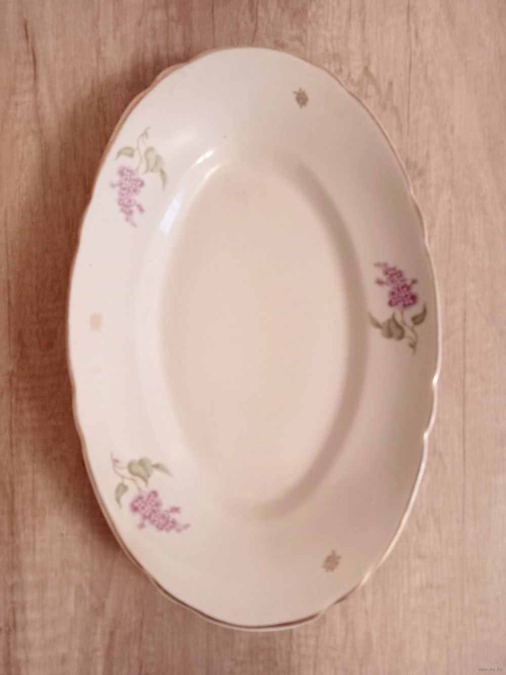 • Оно украшено декором в виде веточек сирени и золотой каймой.