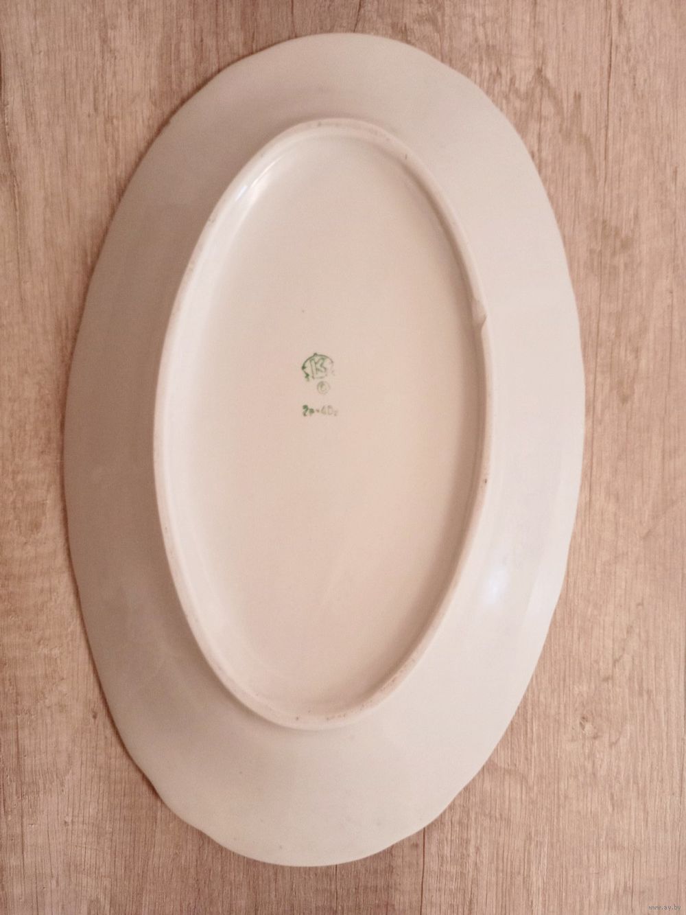 Блюдо из толстого фарфора, тяжелое, большое. имеет овальную форму с волнистым краем.